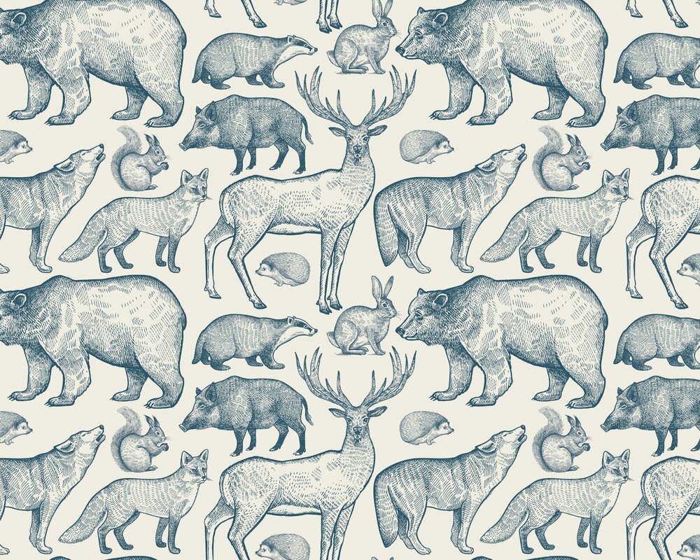 Fotobehang: Cartoon bosdieren in marineblauwe contouren