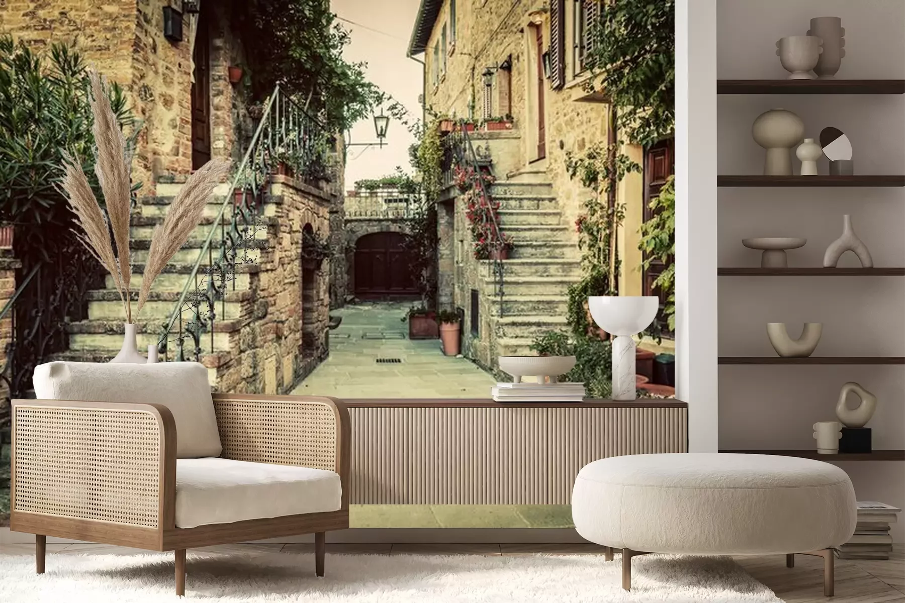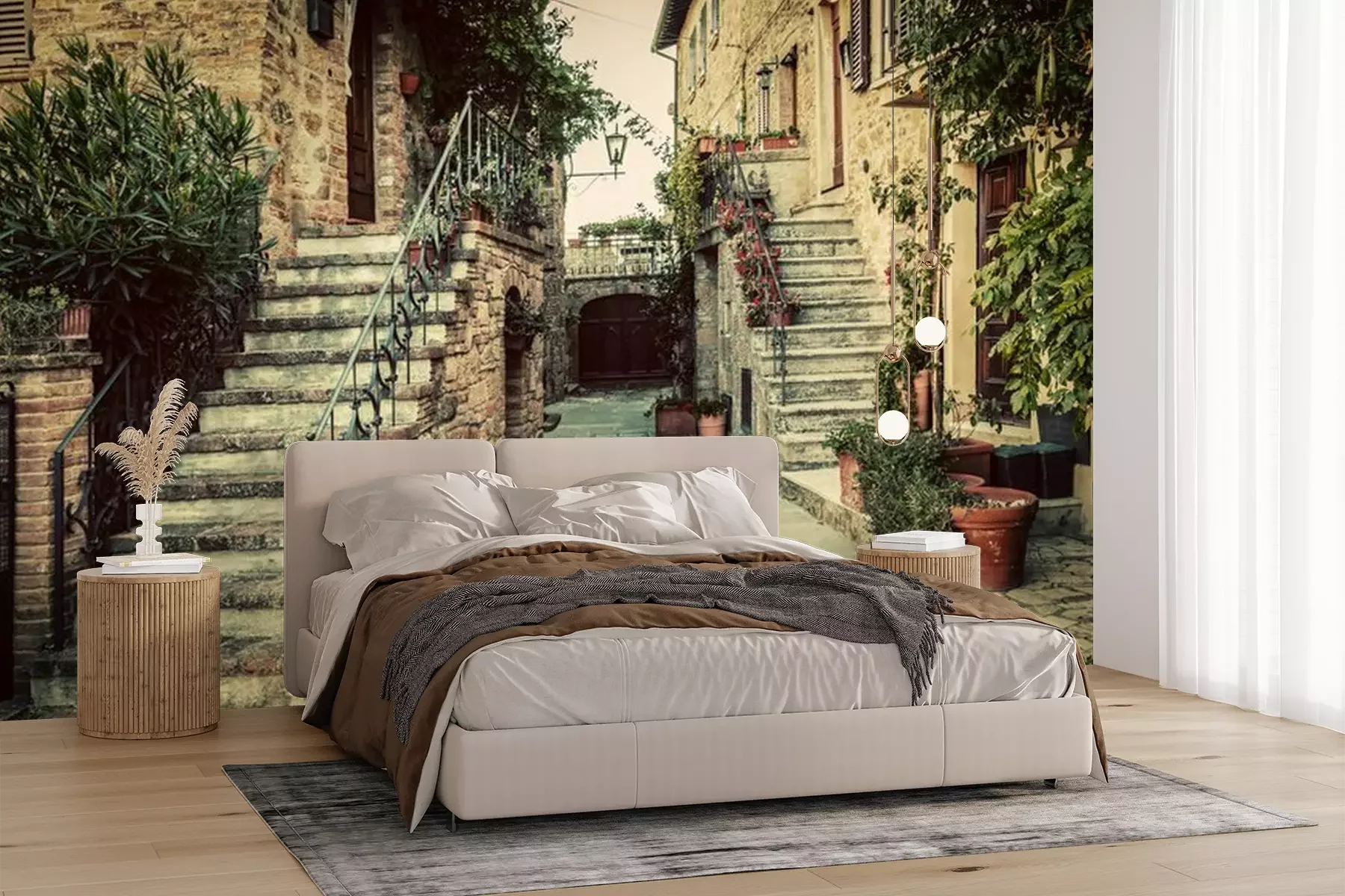 Het materiaal Premium+ is een gestructureerd vinyl op vlies met een gewicht van 255 g/m², dat kleine oneffenheden in de muur effectief camoufleert. De subtiele structuur van fijn zand geeft het oppervlak een exclusieve uitstraling, terwijl de halfmatte afwerking de diepte van de kleuren benadrukt. Het materiaal is dampdoorlatend, waardoor het ook in de keuken en badkamer kan worden gebruikt. De maximale breedte van één baan bedraagt 100 cm – bij grotere afmetingen wordt het fotobehang in meerdere gelijke banen verdeeld. De lijm wordt direct op de muur aangebracht en het behang wordt rand-aan-rand geplakt, wat zorgt voor een esthetisch resultaat zonder zichtbare naden. Het oppervlak kan gemakkelijk worden schoongemaakt door het voorzichtig af te nemen met een vochtige doek.