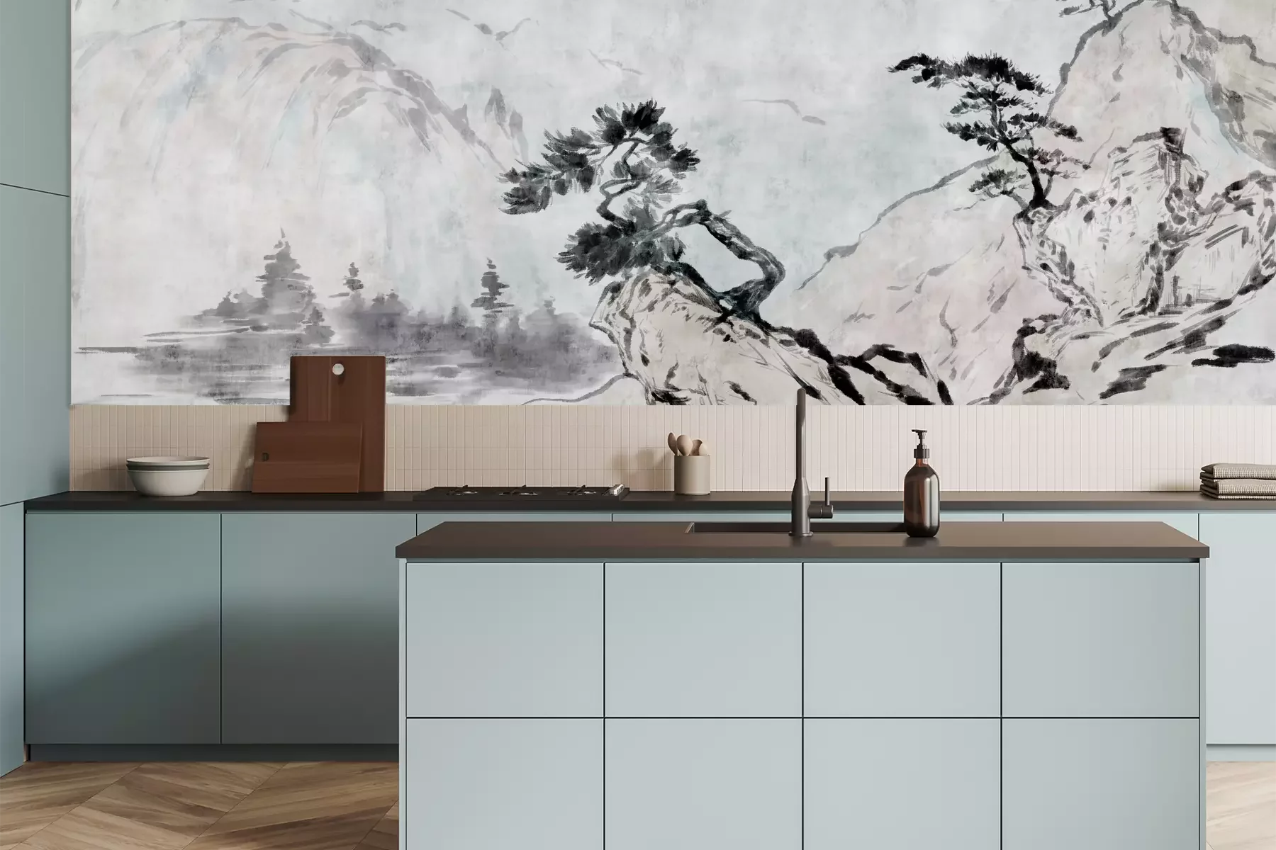 Het materiaal Premium is een glad vinyl op vlies, dat bestand is tegen uitrekken en vervorming. Het is dampdoorlatend – de muren kunnen vrij ademen – waardoor het geschikt is voor gebruik in de keuken en badkamer. Bij vervuiling kan het materiaal worden afgenomen met een vochtige doek. De maximale breedte van één baan bedraagt 95 of 105 cm, afhankelijk van de beschikbaarheid. Montage vindt plaats met de rand-aan-rand methode, wat een esthetisch resultaat zonder zichtbare naden oplevert. Omdat de lijm rechtstreeks op de muur wordt aangebracht, verloopt de installatie van het fotobehang snel en eenvoudig.