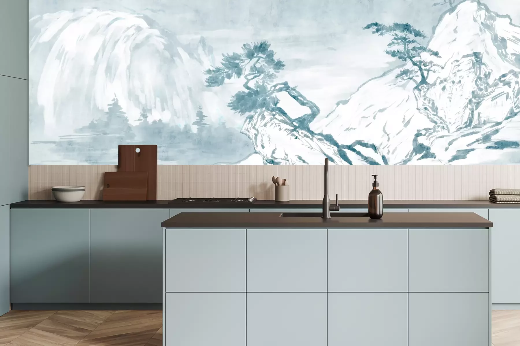 Het materiaal Premium is een glad vinyl op vlies, dat bestand is tegen uitrekken en vervorming. Het is dampdoorlatend – de muren kunnen vrij ademen – waardoor het geschikt is voor gebruik in de keuken en badkamer. Bij vervuiling kan het materiaal worden afgenomen met een vochtige doek. De maximale breedte van één baan bedraagt 95 of 105 cm, afhankelijk van de beschikbaarheid. Montage vindt plaats met de rand-aan-rand methode, wat een esthetisch resultaat zonder zichtbare naden oplevert. Omdat de lijm rechtstreeks op de muur wordt aangebracht, verloopt de installatie van het fotobehang snel en eenvoudig.