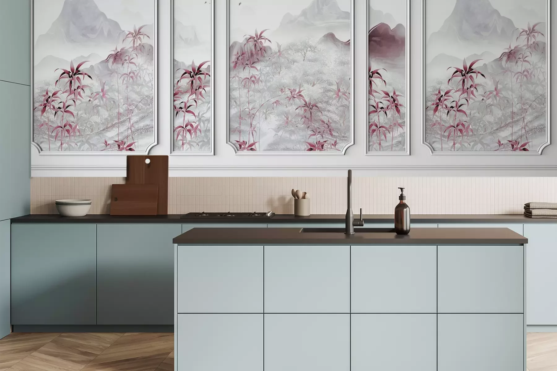 Het materiaal Premium is een glad vinyl op vlies, dat bestand is tegen uitrekken en vervorming. Het is dampdoorlatend – de muren kunnen vrij ademen – waardoor het geschikt is voor gebruik in de keuken en badkamer. Bij vervuiling kan het materiaal worden afgenomen met een vochtige doek. De maximale breedte van één baan bedraagt 95 of 105 cm, afhankelijk van de beschikbaarheid. Montage vindt plaats met de rand-aan-rand methode, wat een esthetisch resultaat zonder zichtbare naden oplevert. Omdat de lijm rechtstreeks op de muur wordt aangebracht, verloopt de installatie van het fotobehang snel en eenvoudig.