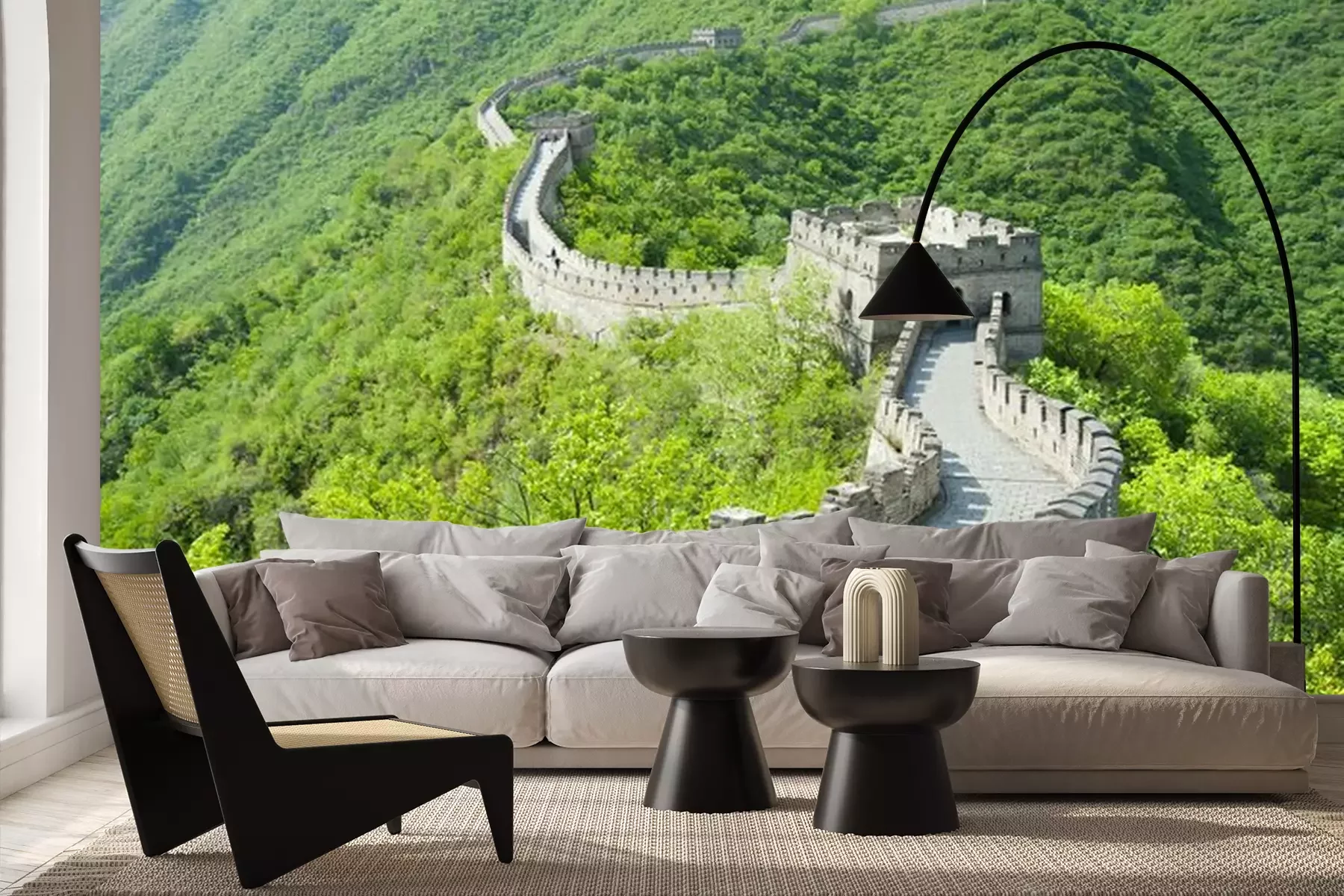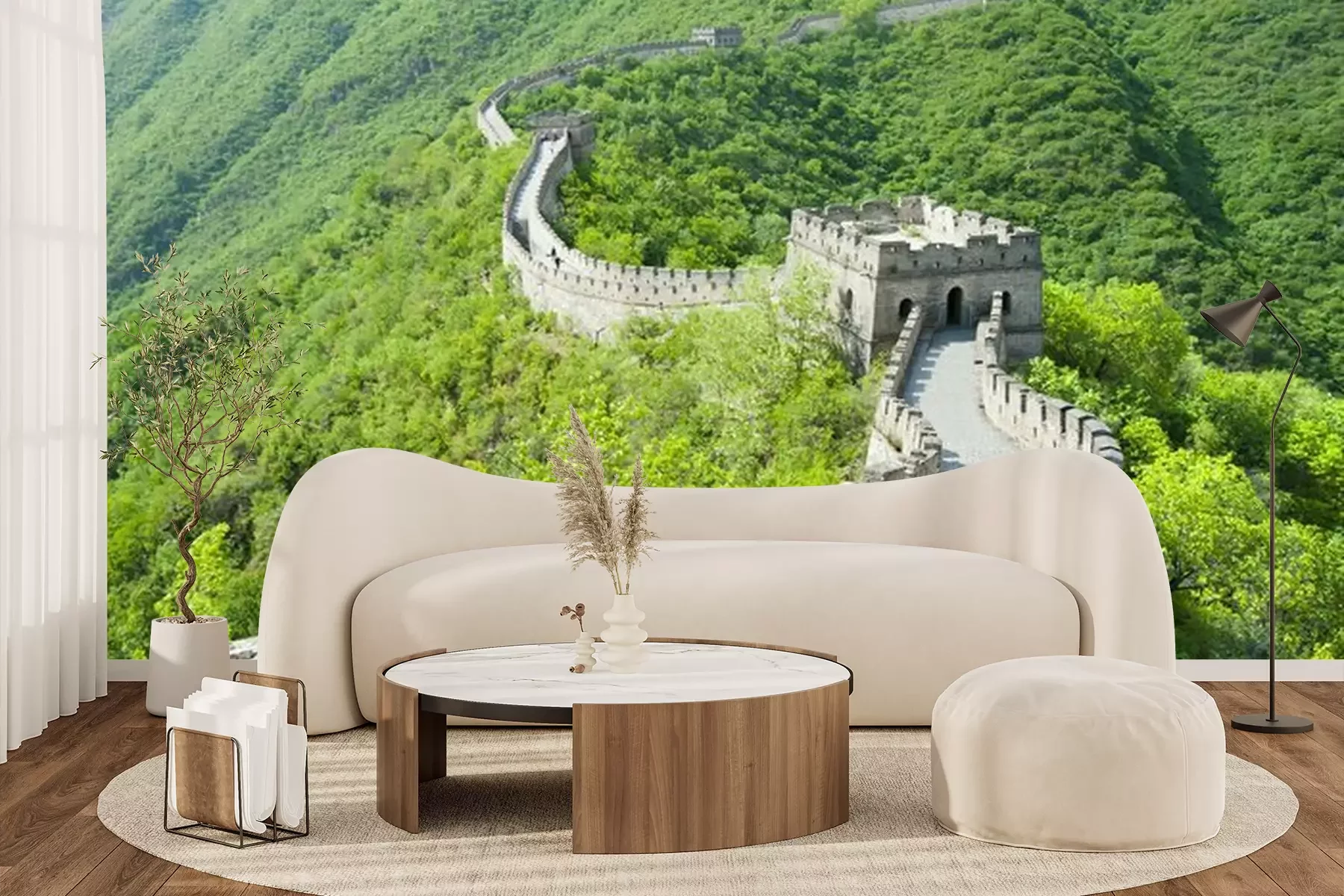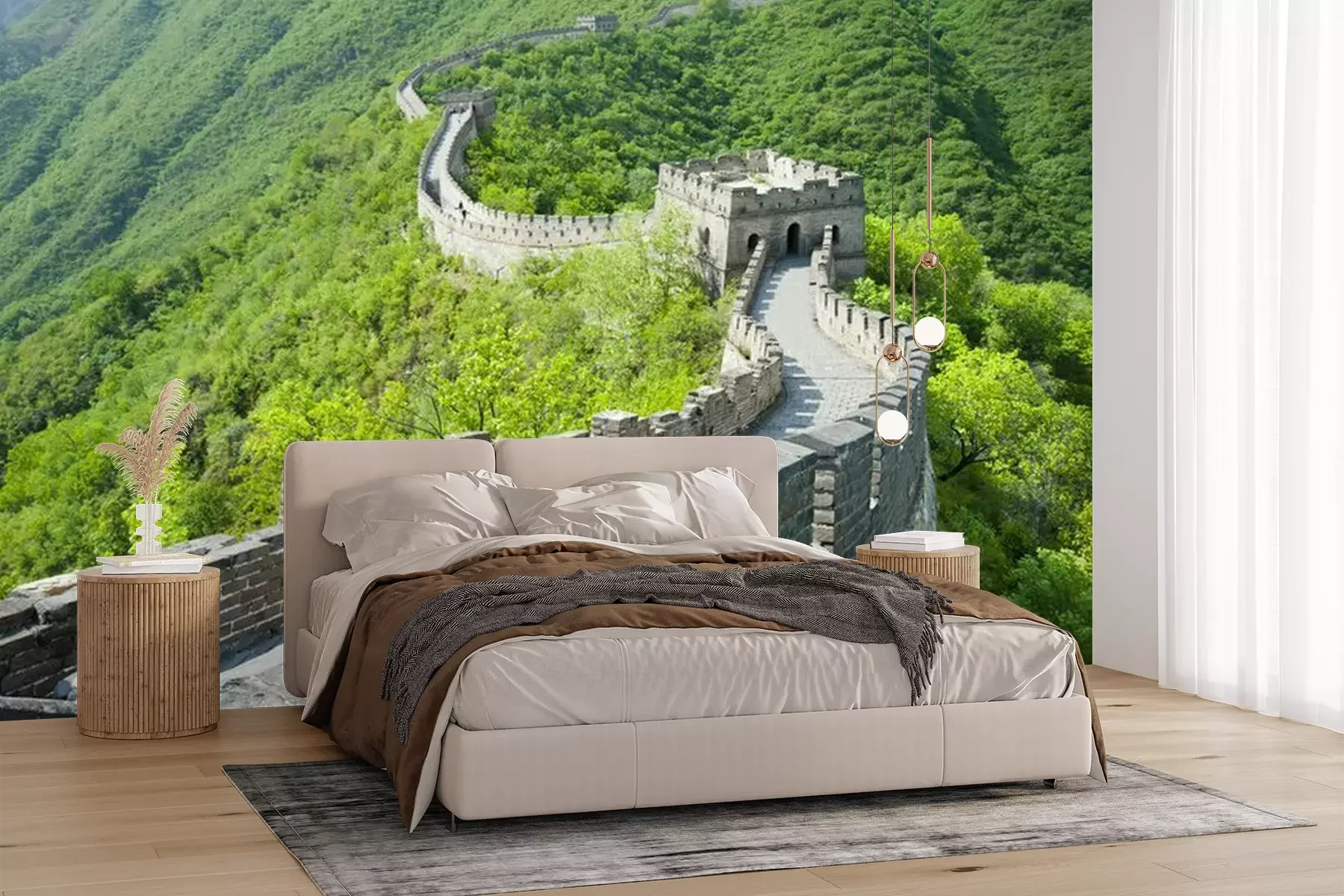 Het materiaal Premium+ is een gestructureerd vinyl op vlies met een gewicht van 255 g/m², dat kleine oneffenheden in de muur effectief camoufleert. De subtiele structuur van fijn zand geeft het oppervlak een exclusieve uitstraling, terwijl de halfmatte afwerking de diepte van de kleuren benadrukt. Het materiaal is dampdoorlatend, waardoor het ook in de keuken en badkamer kan worden gebruikt. De maximale breedte van één baan bedraagt 100 cm – bij grotere afmetingen wordt het fotobehang in meerdere gelijke banen verdeeld. De lijm wordt direct op de muur aangebracht en het behang wordt rand-aan-rand geplakt, wat zorgt voor een esthetisch resultaat zonder zichtbare naden. Het oppervlak kan gemakkelijk worden schoongemaakt door het voorzichtig af te nemen met een vochtige doek.