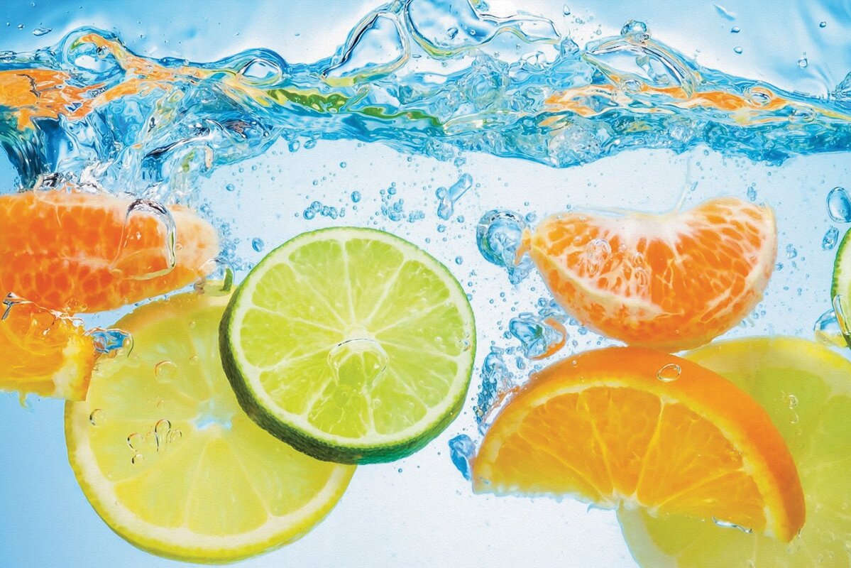Fotobehang: Citroenen en sinaasappelen vallen in het water