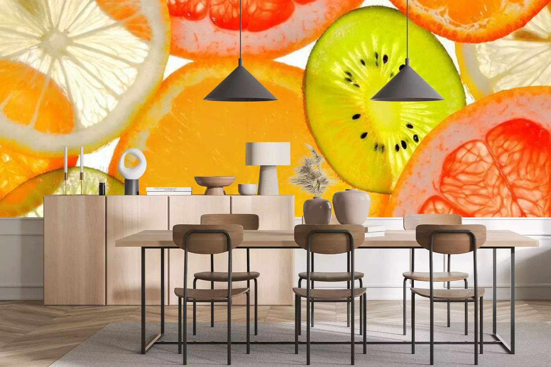 Het materiaal Premium+ is een gestructureerd vinyl op vlies met een gewicht van 255 g/m², dat kleine oneffenheden in de muur effectief camoufleert. De subtiele structuur van fijn zand geeft het oppervlak een exclusieve uitstraling, terwijl de halfmatte afwerking de diepte van de kleuren benadrukt. Het materiaal is dampdoorlatend, waardoor het ook in de keuken en badkamer kan worden gebruikt. De maximale breedte van één baan bedraagt 100 cm – bij grotere afmetingen wordt het fotobehang in meerdere gelijke banen verdeeld. De lijm wordt direct op de muur aangebracht en het behang wordt rand-aan-rand geplakt, wat zorgt voor een esthetisch resultaat zonder zichtbare naden. Het oppervlak kan gemakkelijk worden schoongemaakt door het voorzichtig af te nemen met een vochtige doek.