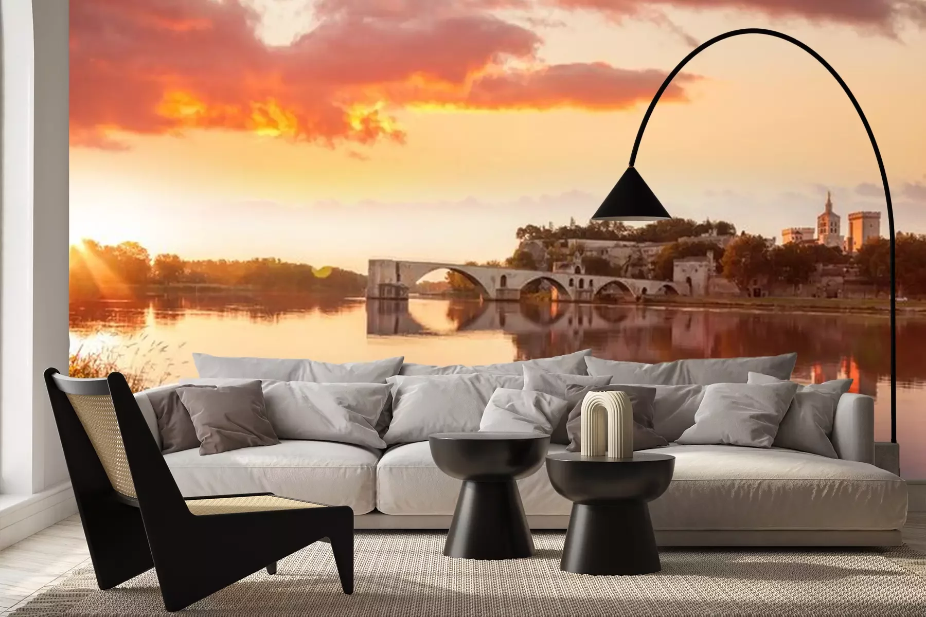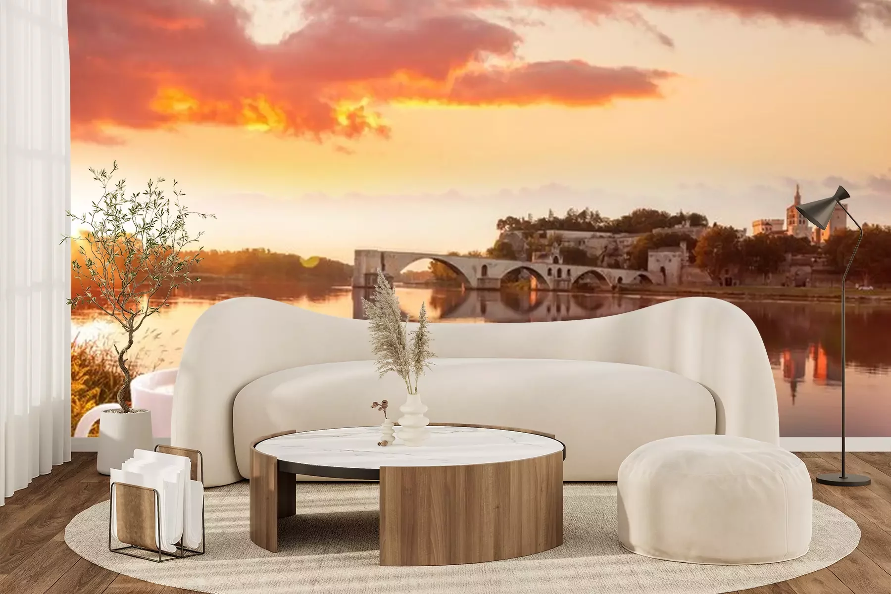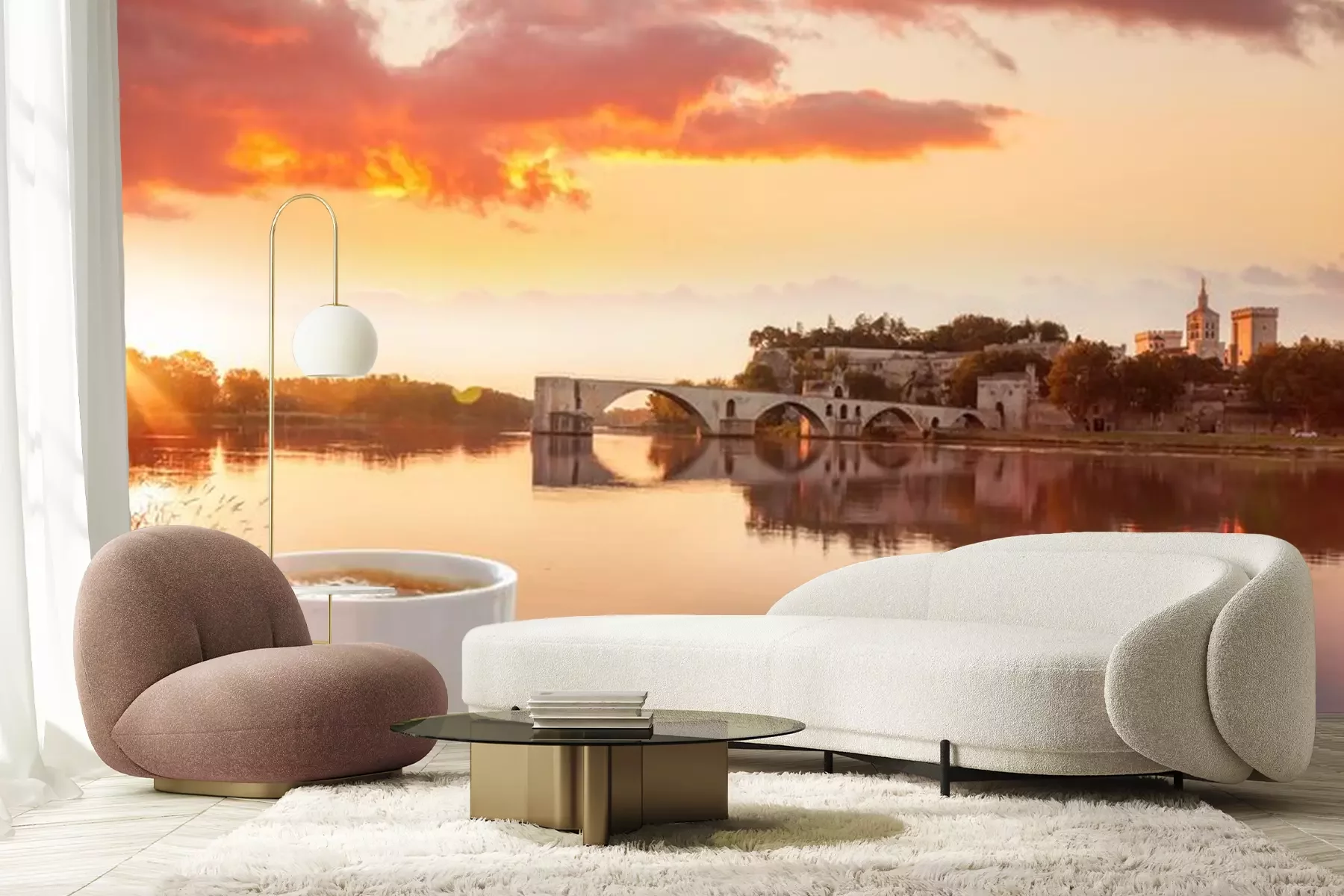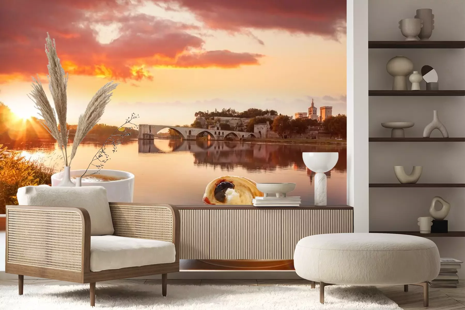 Fotobehang Coffee with croissants against Avignon old bridge in Provence, France
