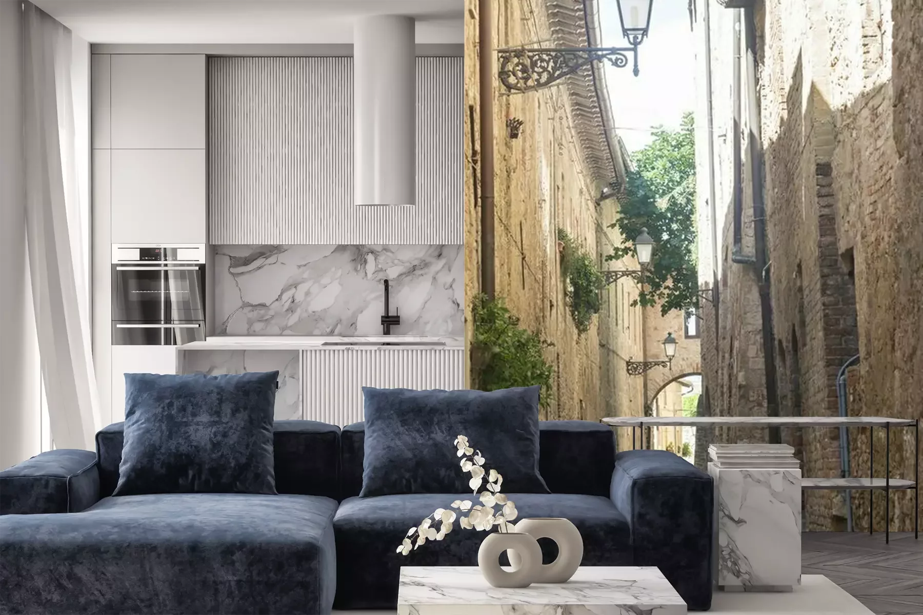 Het materiaal Premium is een glad vinyl op vlies, dat bestand is tegen uitrekken en vervorming. Het is dampdoorlatend – de muren kunnen vrij ademen – waardoor het geschikt is voor gebruik in de keuken en badkamer. Bij vervuiling kan het materiaal worden afgenomen met een vochtige doek. De maximale breedte van één baan bedraagt 95 of 105 cm, afhankelijk van de beschikbaarheid. Montage vindt plaats met de rand-aan-rand methode, wat een esthetisch resultaat zonder zichtbare naden oplevert. Omdat de lijm rechtstreeks op de muur wordt aangebracht, verloopt de installatie van het fotobehang snel en eenvoudig.