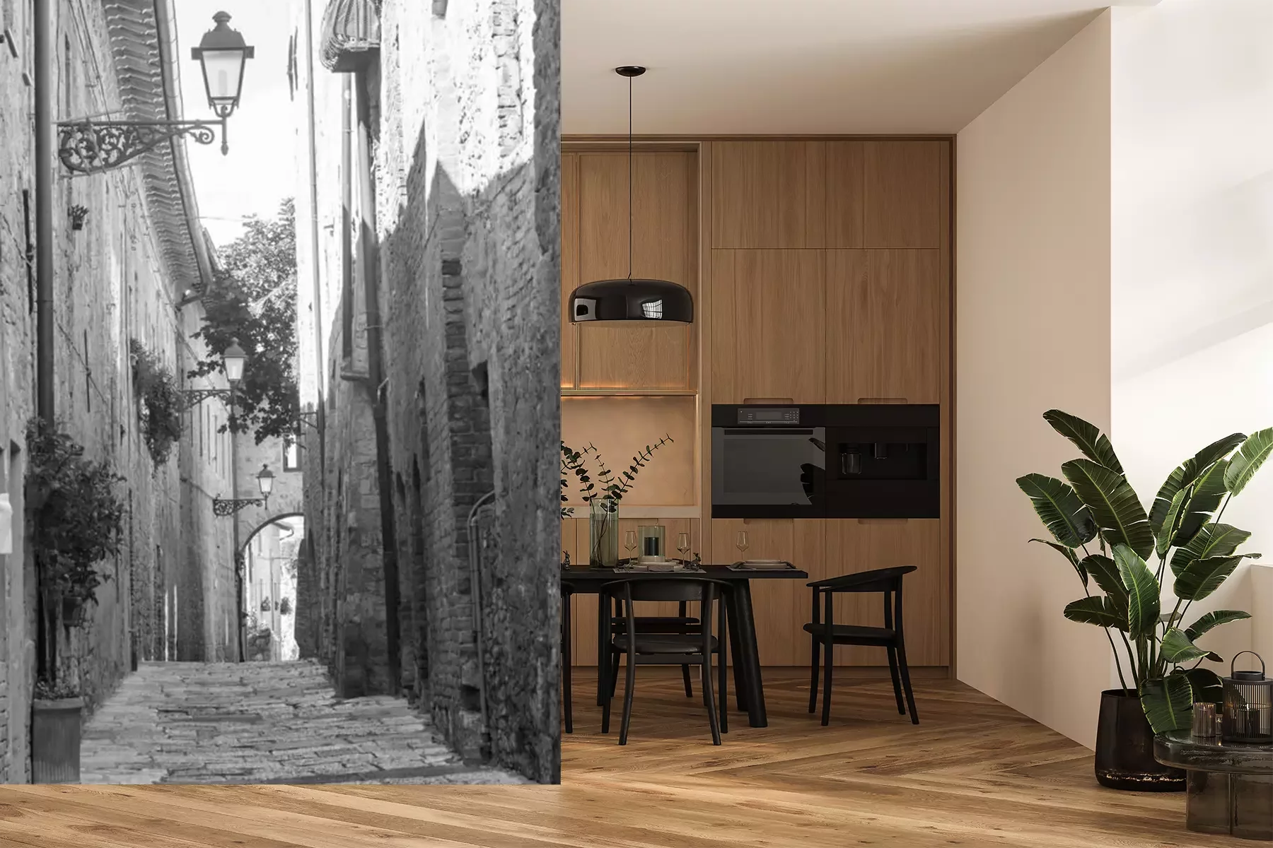 Het materiaal Premium is een glad vinyl op vlies, dat bestand is tegen uitrekken en vervorming. Het is dampdoorlatend – de muren kunnen vrij ademen – waardoor het geschikt is voor gebruik in de keuken en badkamer. Bij vervuiling kan het materiaal worden afgenomen met een vochtige doek. De maximale breedte van één baan bedraagt 95 of 105 cm, afhankelijk van de beschikbaarheid. Montage vindt plaats met de rand-aan-rand methode, wat een esthetisch resultaat zonder zichtbare naden oplevert. Omdat de lijm rechtstreeks op de muur wordt aangebracht, verloopt de installatie van het fotobehang snel en eenvoudig.