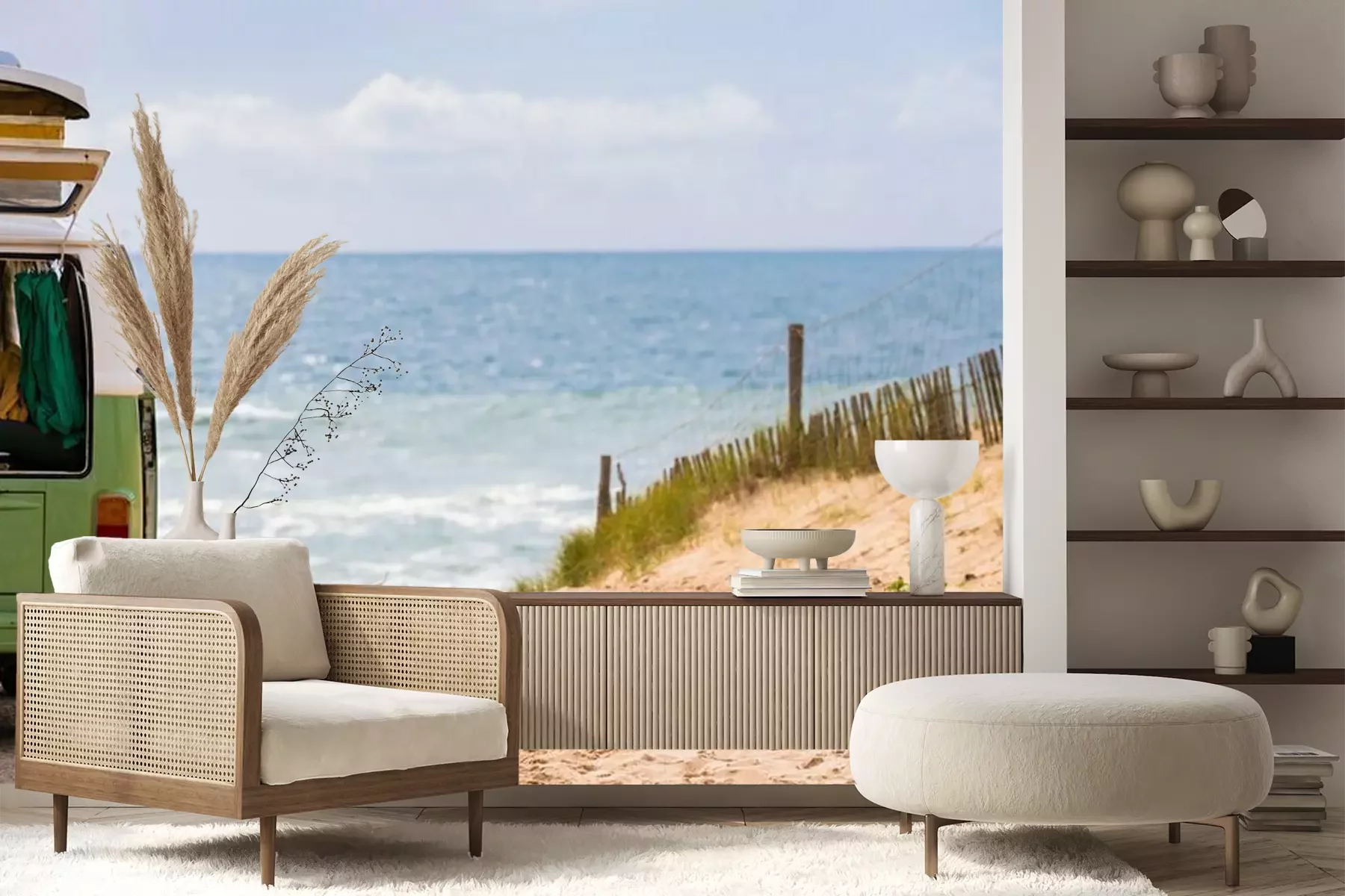 Het materiaal Premium+ is een gestructureerd vinyl op vlies met een gewicht van 255 g/m², dat kleine oneffenheden in de muur effectief camoufleert. De subtiele structuur van fijn zand geeft het oppervlak een exclusieve uitstraling, terwijl de halfmatte afwerking de diepte van de kleuren benadrukt. Het materiaal is dampdoorlatend, waardoor het ook in de keuken en badkamer kan worden gebruikt. De maximale breedte van één baan bedraagt 100 cm – bij grotere afmetingen wordt het fotobehang in meerdere gelijke banen verdeeld. De lijm wordt direct op de muur aangebracht en het behang wordt rand-aan-rand geplakt, wat zorgt voor een esthetisch resultaat zonder zichtbare naden. Het oppervlak kan gemakkelijk worden schoongemaakt door het voorzichtig af te nemen met een vochtige doek.