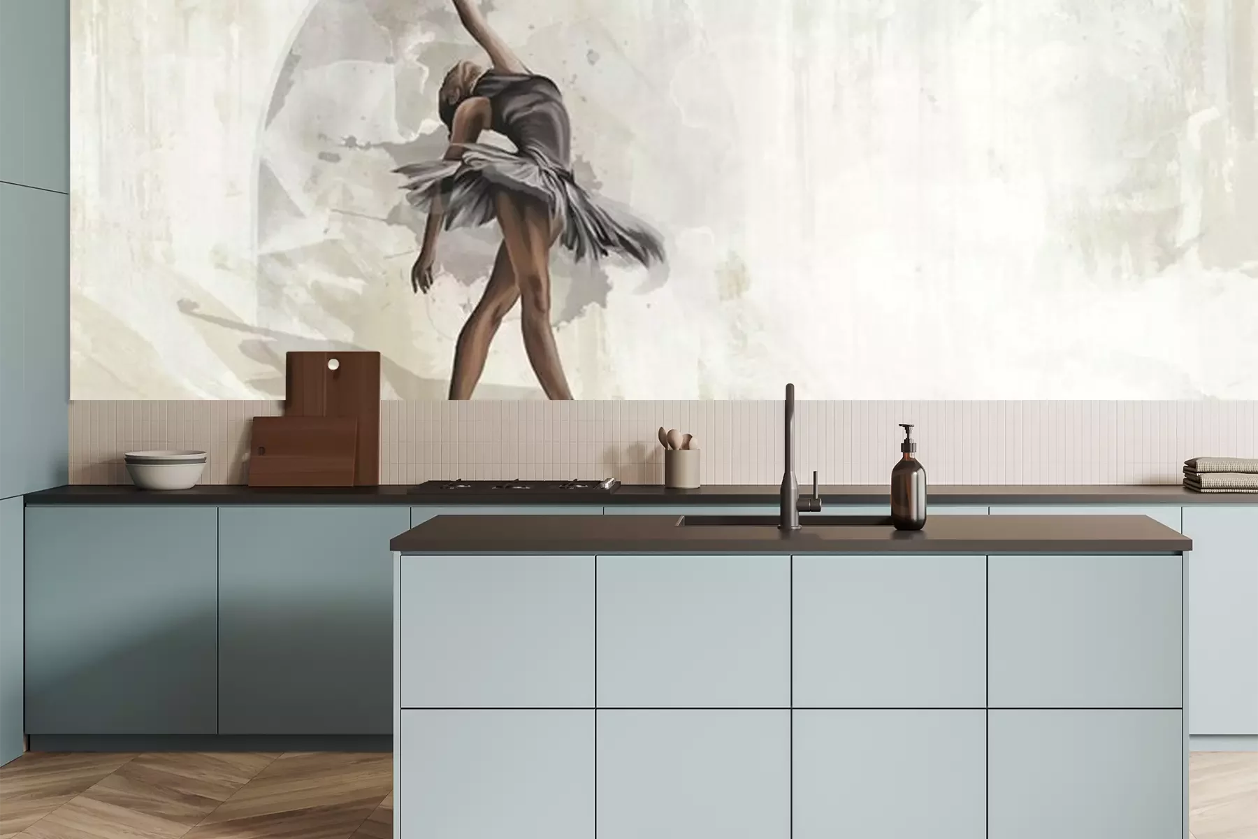 Het materiaal Premium is een glad vinyl op vlies, dat bestand is tegen uitrekken en vervorming. Het is dampdoorlatend – de muren kunnen vrij ademen – waardoor het geschikt is voor gebruik in de keuken en badkamer. Bij vervuiling kan het materiaal worden afgenomen met een vochtige doek. De maximale breedte van één baan bedraagt 95 of 105 cm, afhankelijk van de beschikbaarheid. Montage vindt plaats met de rand-aan-rand methode, wat een esthetisch resultaat zonder zichtbare naden oplevert. Omdat de lijm rechtstreeks op de muur wordt aangebracht, verloopt de installatie van het fotobehang snel en eenvoudig.