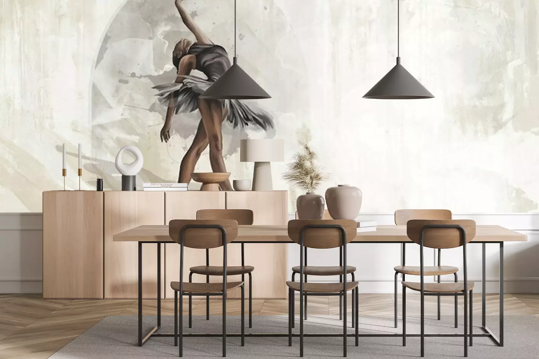 Het materiaal Premium+ is een gestructureerd vinyl op vlies met een gewicht van 255 g/m², dat kleine oneffenheden in de muur effectief camoufleert. De subtiele structuur van fijn zand geeft het oppervlak een exclusieve uitstraling, terwijl de halfmatte afwerking de diepte van de kleuren benadrukt. Het materiaal is dampdoorlatend, waardoor het ook in de keuken en badkamer kan worden gebruikt. De maximale breedte van één baan bedraagt 100 cm – bij grotere afmetingen wordt het fotobehang in meerdere gelijke banen verdeeld. De lijm wordt direct op de muur aangebracht en het behang wordt rand-aan-rand geplakt, wat zorgt voor een esthetisch resultaat zonder zichtbare naden. Het oppervlak kan gemakkelijk worden schoongemaakt door het voorzichtig af te nemen met een vochtige doek.