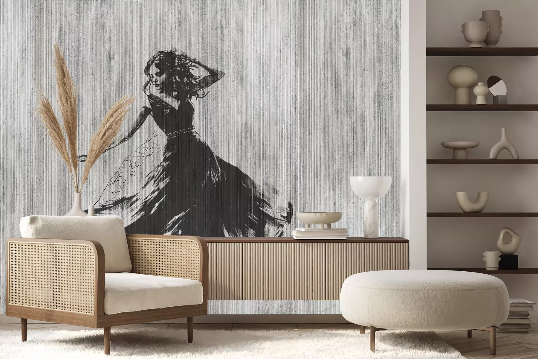 Het materiaal Premium+ is een gestructureerd vinyl op vlies met een gewicht van 255 g/m², dat kleine oneffenheden in de muur effectief camoufleert. De subtiele structuur van fijn zand geeft het oppervlak een exclusieve uitstraling, terwijl de halfmatte afwerking de diepte van de kleuren benadrukt. Het materiaal is dampdoorlatend, waardoor het ook in de keuken en badkamer kan worden gebruikt. De maximale breedte van één baan bedraagt 100 cm – bij grotere afmetingen wordt het fotobehang in meerdere gelijke banen verdeeld. De lijm wordt direct op de muur aangebracht en het behang wordt rand-aan-rand geplakt, wat zorgt voor een esthetisch resultaat zonder zichtbare naden. Het oppervlak kan gemakkelijk worden schoongemaakt door het voorzichtig af te nemen met een vochtige doek.
