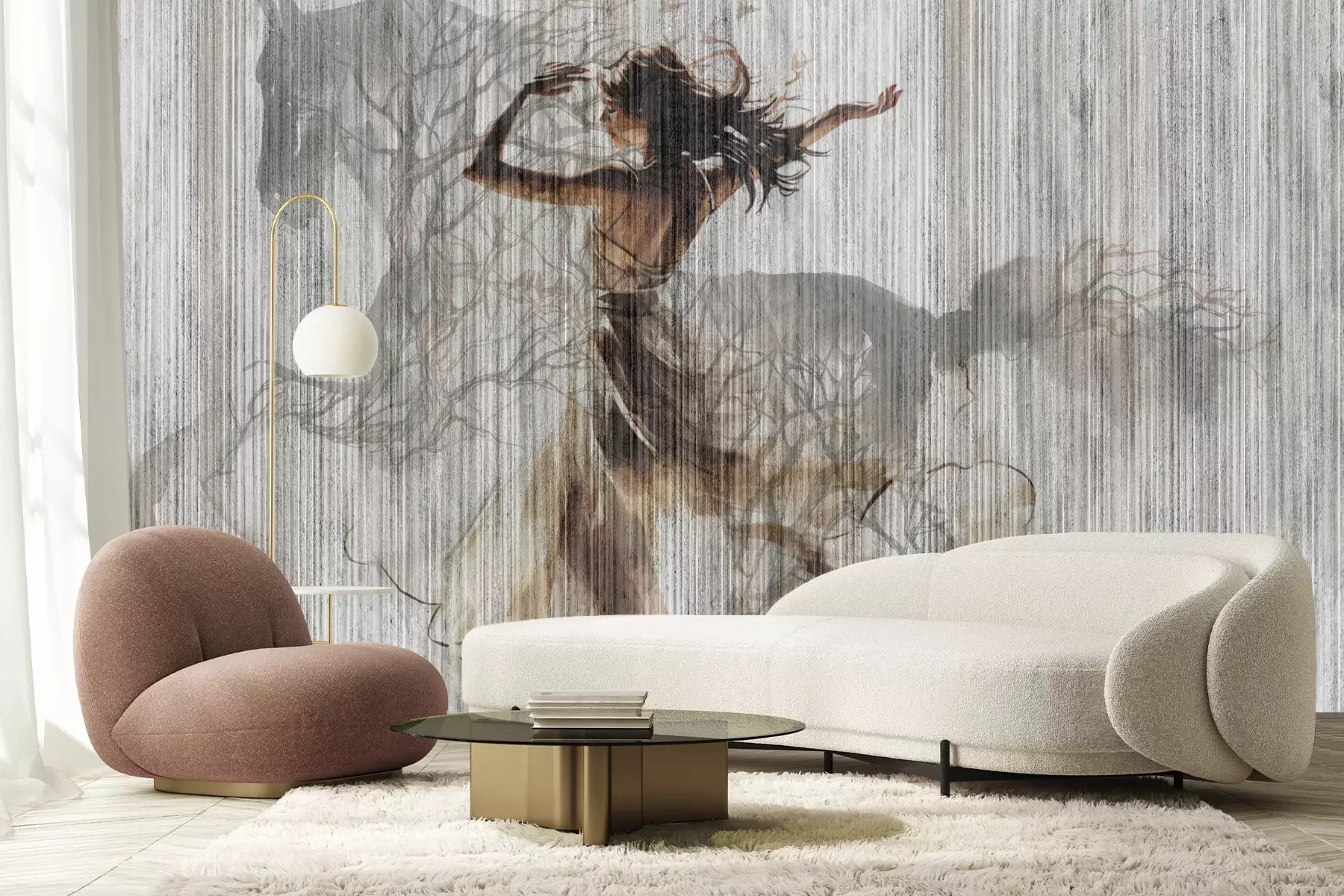 Het artistieke fotobehang is een uitstekende keuze voor iedereen die waarde hecht aan unieke interieurinrichtingen en op zoek is naar originele oplossingen om een droomruimte te creëren – los van de heersende trends. Op het eerste gezicht trekt de bijzondere compositie van dit fotobehang de aandacht: vrouw met een wapperende jurk die samensmelt met de silhouet van een majestueus paard en de takken van een uitgestrekte boom. Deze artistieke collage wordt een intrigerende decoratie die elke dag iets nieuws kan onthullen.Omdat kunst nooit uit de mode raakt, is dit een tijdloos fotobehang. Paard, vaak afgebeeld in de schilderkunst, brengt elegantie, lichtheid en dynamiek in de ruimte. Daarom komt deze decoratie perfect tot zijn recht in zowel een glamoureuze woonkamer als een romantische slaapkamer in beige- of grijstinten. Aangezien dit een zeer expressief fotobehang is, komt de vrouw op de artistieke illustratie het best tot haar recht als het centrale en enige decoratieve element in de kamer. Zo voorkom je visuele overbelasting en behoud je een harmonieuze, doordachte uitstraling van het geheel. De uitstekende materiaalkwaliteit van onze wanddecoratie zorgt ervoor dat dit niet alleen geschikt is voor particuliere interieurs, maar ook voor drukbezochte commerciële ruimtes. In de lobby van een stijlvol hotel zal ons fotobehang prachtig tot zijn recht komen. Paard met de dansende vrouw brengt een artistieke sfeer in het interieur en zal een blijvende indruk achterlaten bij de gasten. Het is ook een uitstekende keuze voor beautysalons en spa’s, waar niet alleen de esthetiek telt, maar ook de ontspannen sfeer die ons fotobehang creëert. Dans brengt lichtheid in de ruimte en zorgt voor een harmonieus en inspirerend geheel.