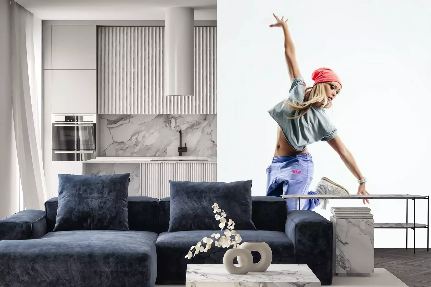 Het materiaal Premium is een glad vinyl op vlies, dat bestand is tegen uitrekken en vervorming. Het is dampdoorlatend – de muren kunnen vrij ademen – waardoor het geschikt is voor gebruik in de keuken en badkamer. Bij vervuiling kan het materiaal worden afgenomen met een vochtige doek. De maximale breedte van één baan bedraagt 95 of 105 cm, afhankelijk van de beschikbaarheid. Montage vindt plaats met de rand-aan-rand methode, wat een esthetisch resultaat zonder zichtbare naden oplevert. Omdat de lijm rechtstreeks op de muur wordt aangebracht, verloopt de installatie van het fotobehang snel en eenvoudig.