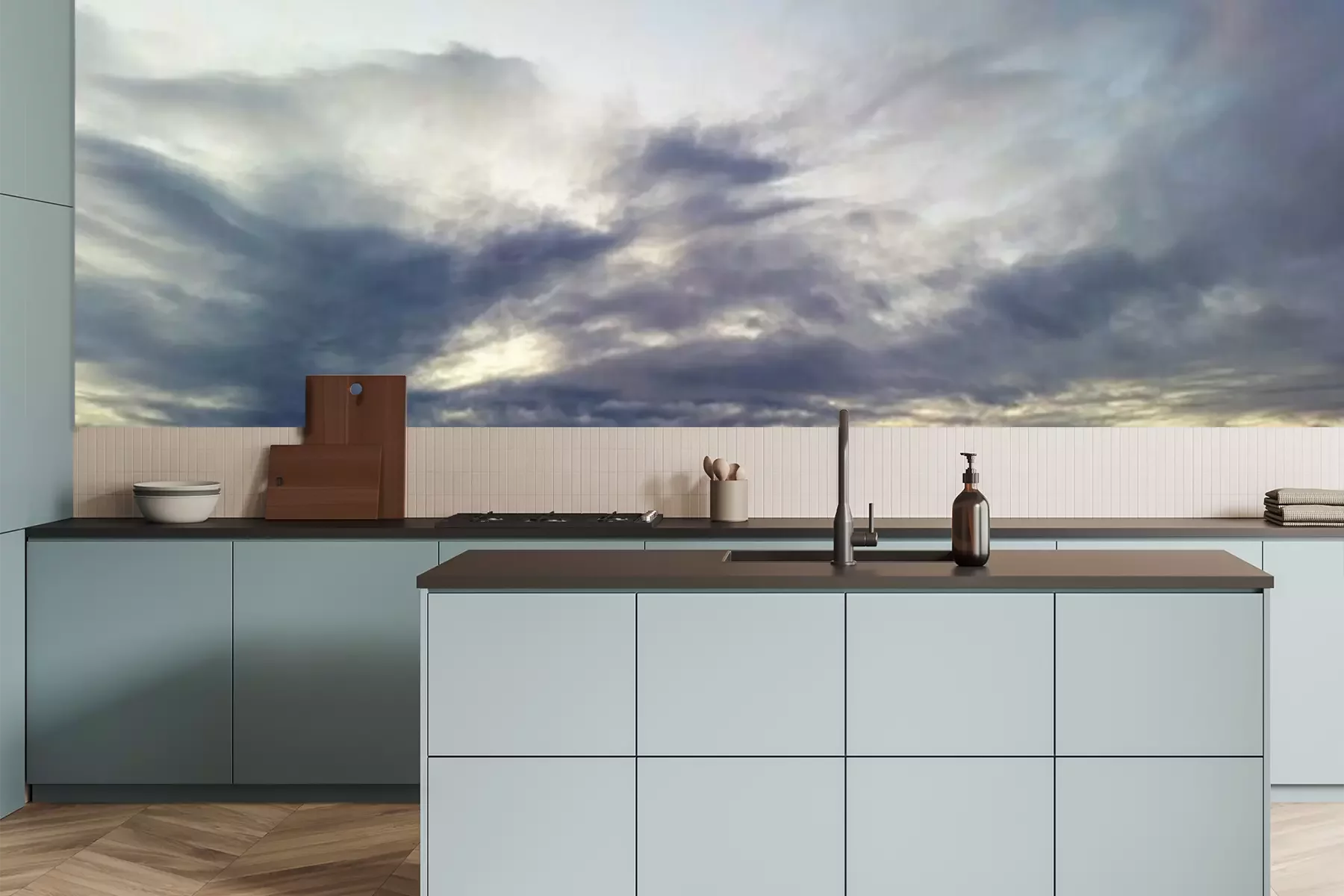 Het materiaal Premium is een glad vinyl op vlies, dat bestand is tegen uitrekken en vervorming. Het is dampdoorlatend – de muren kunnen vrij ademen – waardoor het geschikt is voor gebruik in de keuken en badkamer. Bij vervuiling kan het materiaal worden afgenomen met een vochtige doek. De maximale breedte van één baan bedraagt 95 of 105 cm, afhankelijk van de beschikbaarheid. Montage vindt plaats met de rand-aan-rand methode, wat een esthetisch resultaat zonder zichtbare naden oplevert. Omdat de lijm rechtstreeks op de muur wordt aangebracht, verloopt de installatie van het fotobehang snel en eenvoudig.