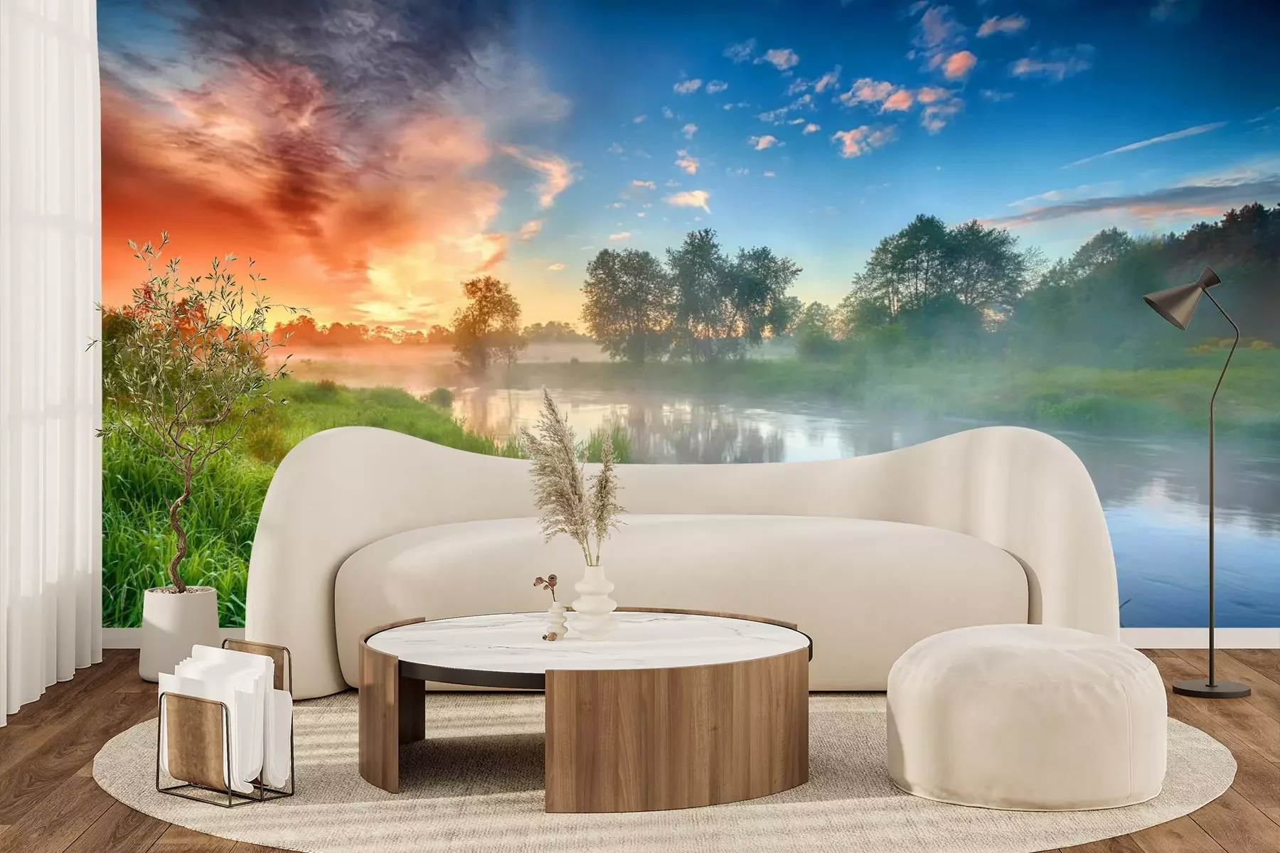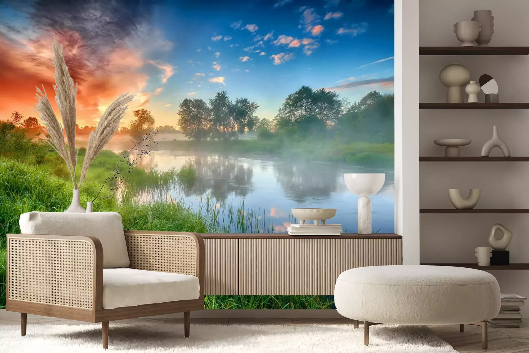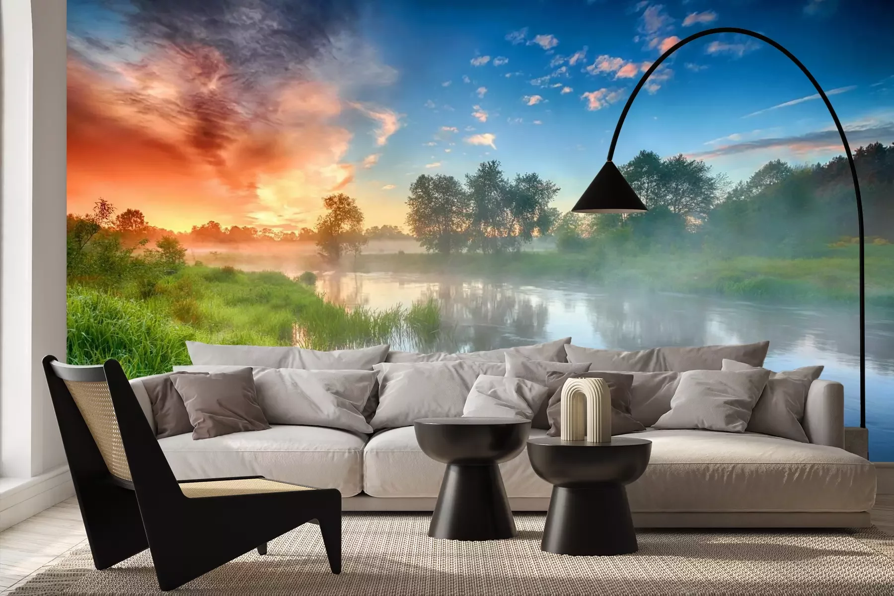 Het materiaal Premium+ is een gestructureerd vinyl op vlies met een gewicht van 255 g/m², dat kleine oneffenheden in de muur effectief camoufleert. De subtiele structuur van fijn zand geeft het oppervlak een exclusieve uitstraling, terwijl de halfmatte afwerking de diepte van de kleuren benadrukt. Het materiaal is dampdoorlatend, waardoor het ook in de keuken en badkamer kan worden gebruikt. De maximale breedte van één baan bedraagt 100 cm – bij grotere afmetingen wordt het fotobehang in meerdere gelijke banen verdeeld. De lijm wordt direct op de muur aangebracht en het behang wordt rand-aan-rand geplakt, wat zorgt voor een esthetisch resultaat zonder zichtbare naden. Het oppervlak kan gemakkelijk worden schoongemaakt door het voorzichtig af te nemen met een vochtige doek.