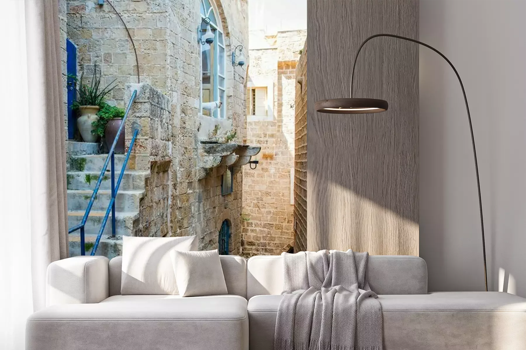 Het materiaal Premium+ is een gestructureerd vinyl op vlies met een gewicht van 255 g/m², dat kleine oneffenheden in de muur effectief camoufleert. De subtiele structuur van fijn zand geeft het oppervlak een exclusieve uitstraling, terwijl de halfmatte afwerking de diepte van de kleuren benadrukt. Het materiaal is dampdoorlatend, waardoor het ook in de keuken en badkamer kan worden gebruikt. De maximale breedte van één baan bedraagt 100 cm – bij grotere afmetingen wordt het fotobehang in meerdere gelijke banen verdeeld. De lijm wordt direct op de muur aangebracht en het behang wordt rand-aan-rand geplakt, wat zorgt voor een esthetisch resultaat zonder zichtbare naden. Het oppervlak kan gemakkelijk worden schoongemaakt door het voorzichtig af te nemen met een vochtige doek.