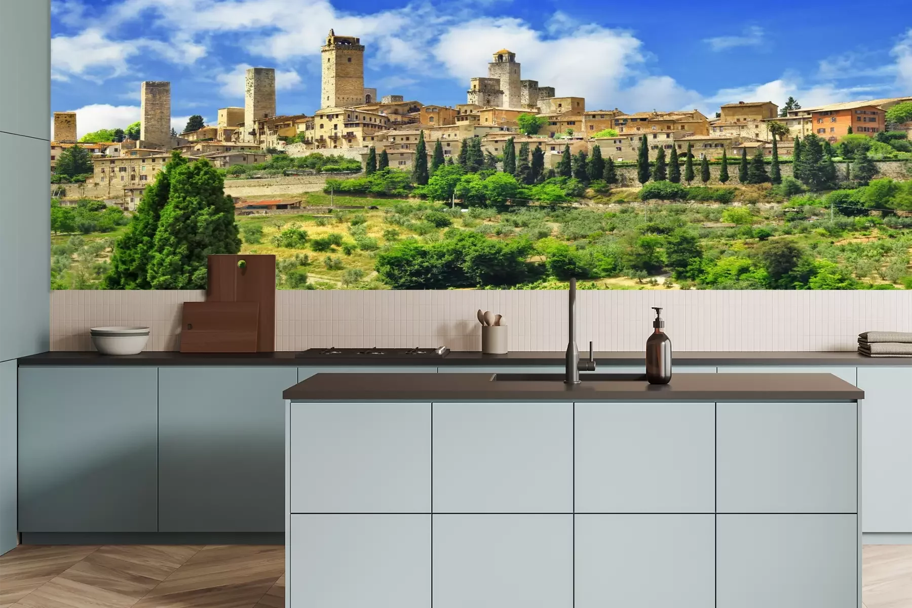 Het materiaal Premium is een glad vinyl op vlies, dat bestand is tegen uitrekken en vervorming. Het is dampdoorlatend – de muren kunnen vrij ademen – waardoor het geschikt is voor gebruik in de keuken en badkamer. Bij vervuiling kan het materiaal worden afgenomen met een vochtige doek. De maximale breedte van één baan bedraagt 95 of 105 cm, afhankelijk van de beschikbaarheid. Montage vindt plaats met de rand-aan-rand methode, wat een esthetisch resultaat zonder zichtbare naden oplevert. Omdat de lijm rechtstreeks op de muur wordt aangebracht, verloopt de installatie van het fotobehang snel en eenvoudig.