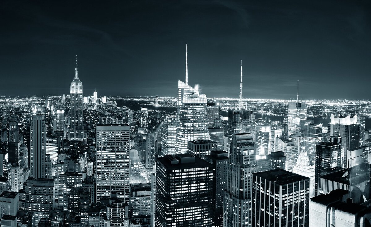 De lichten van new york 's nachts met wolkenkrabbers op de achtergrond