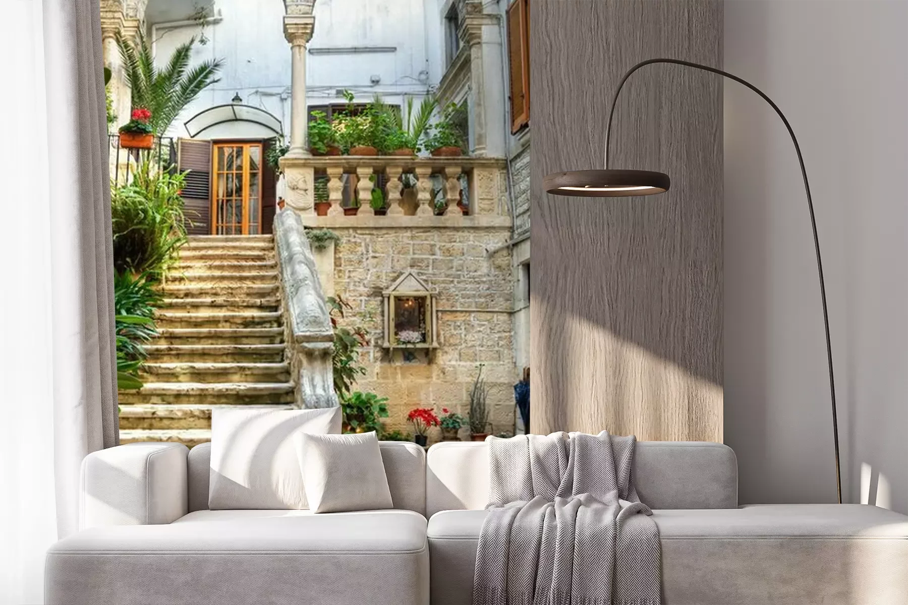 Het materiaal Premium+ is een gestructureerd vinyl op vlies met een gewicht van 255 g/m², dat kleine oneffenheden in de muur effectief camoufleert. De subtiele structuur van fijn zand geeft het oppervlak een exclusieve uitstraling, terwijl de halfmatte afwerking de diepte van de kleuren benadrukt. Het materiaal is dampdoorlatend, waardoor het ook in de keuken en badkamer kan worden gebruikt. De maximale breedte van één baan bedraagt 100 cm – bij grotere afmetingen wordt het fotobehang in meerdere gelijke banen verdeeld. De lijm wordt direct op de muur aangebracht en het behang wordt rand-aan-rand geplakt, wat zorgt voor een esthetisch resultaat zonder zichtbare naden. Het oppervlak kan gemakkelijk worden schoongemaakt door het voorzichtig af te nemen met een vochtige doek.