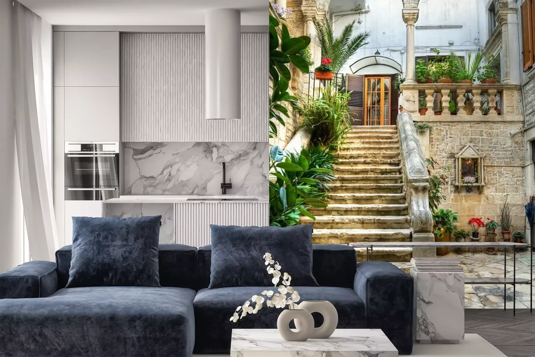 Het materiaal Premium is een glad vinyl op vlies, dat bestand is tegen uitrekken en vervorming. Het is dampdoorlatend – de muren kunnen vrij ademen – waardoor het geschikt is voor gebruik in de keuken en badkamer. Bij vervuiling kan het materiaal worden afgenomen met een vochtige doek. De maximale breedte van één baan bedraagt 95 of 105 cm, afhankelijk van de beschikbaarheid. Montage vindt plaats met de rand-aan-rand methode, wat een esthetisch resultaat zonder zichtbare naden oplevert. Omdat de lijm rechtstreeks op de muur wordt aangebracht, verloopt de installatie van het fotobehang snel en eenvoudig.