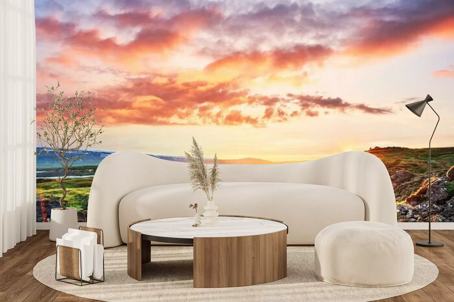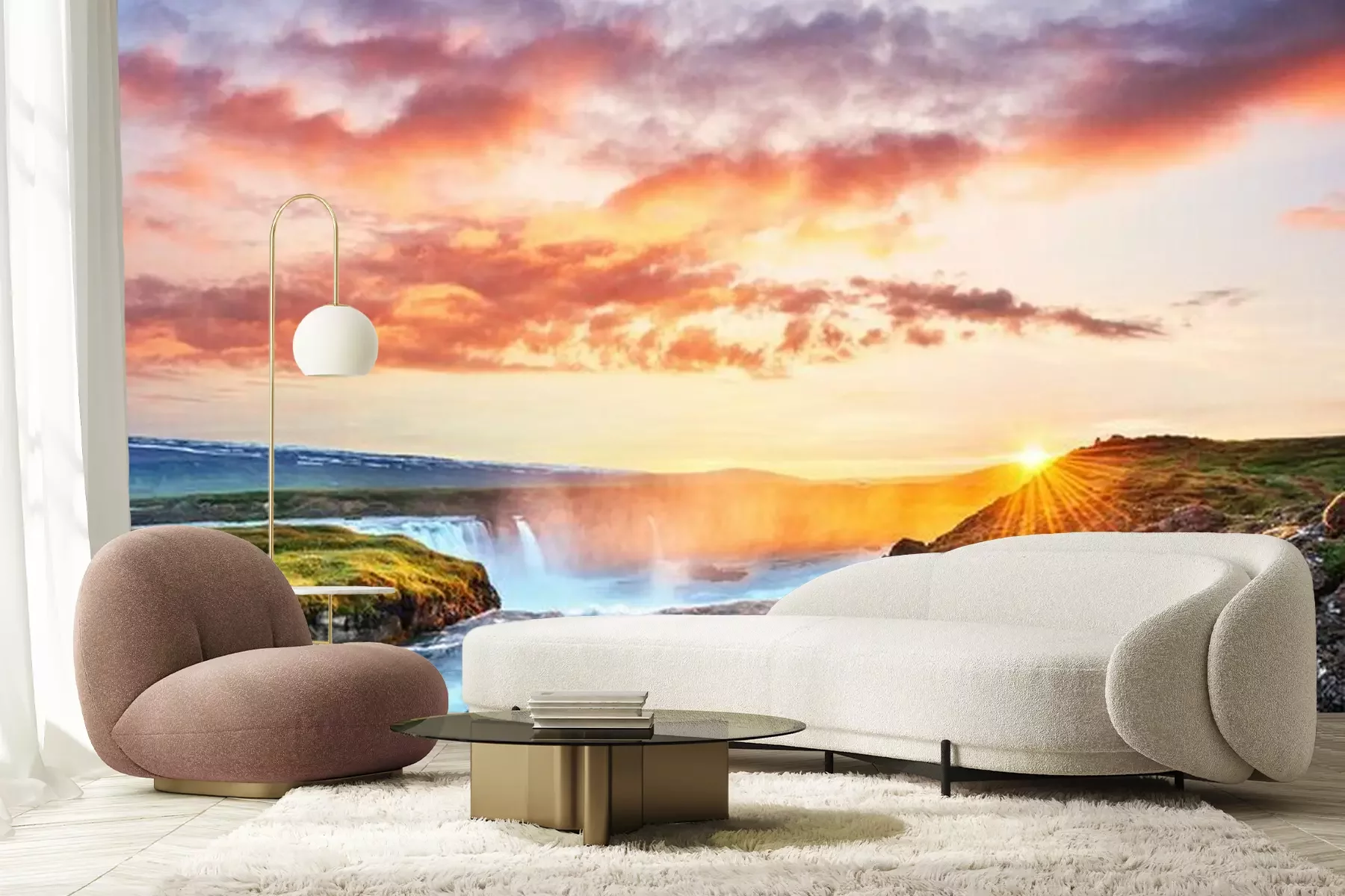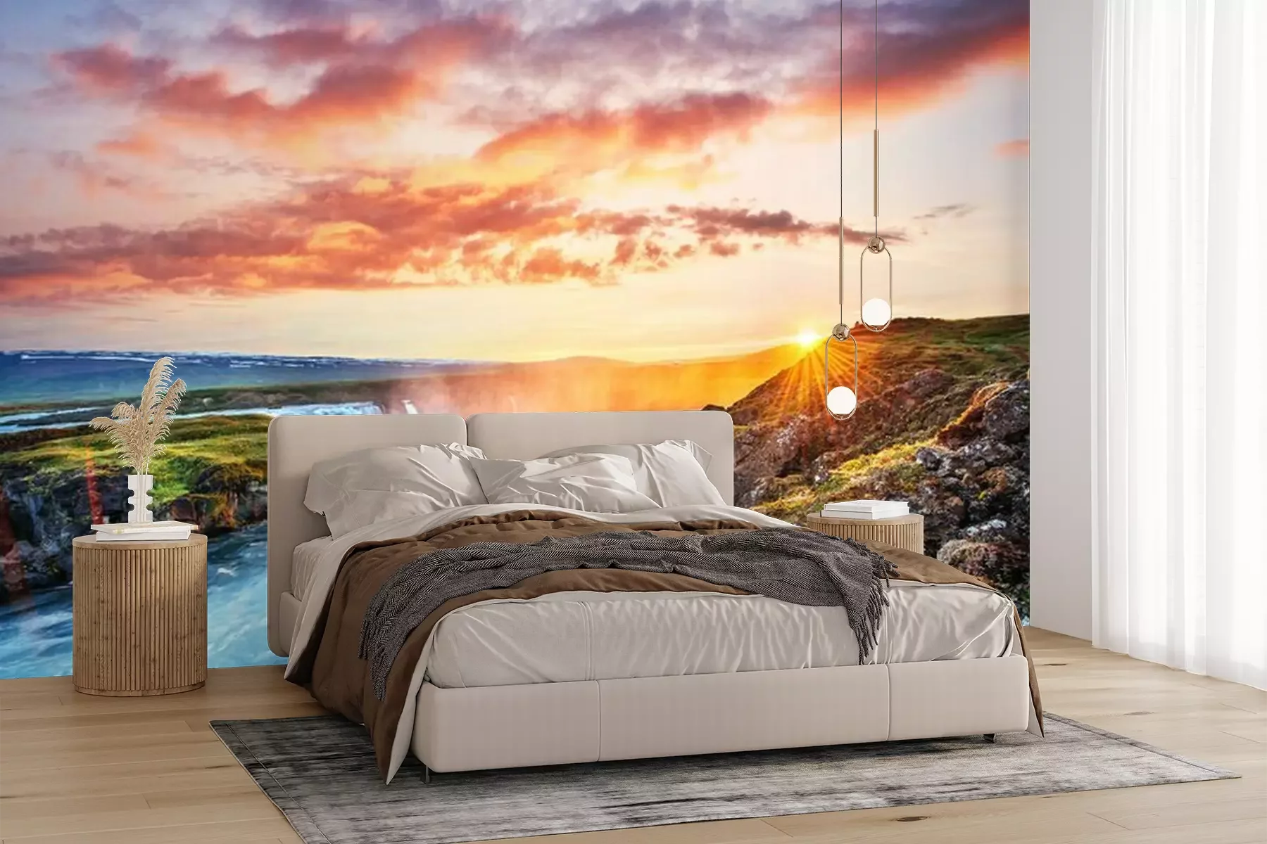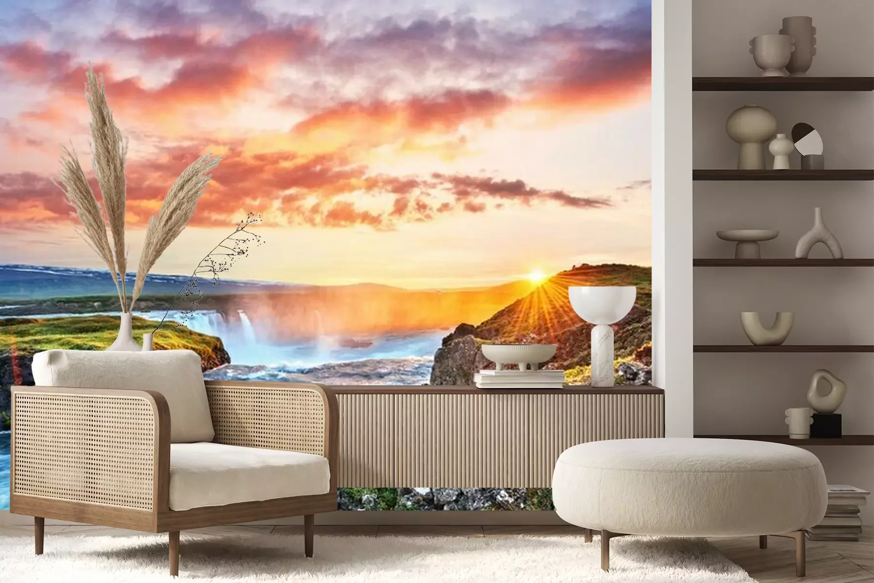 Fotobehang De schilderachtige zonsondergang over landschappen en watervallen. Kirkjufell-berg