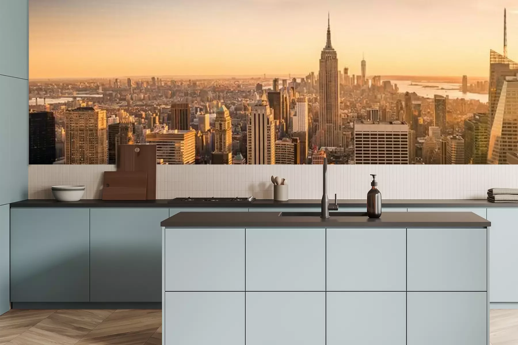 Het materiaal Premium is een glad vinyl op vlies, dat bestand is tegen uitrekken en vervorming. Het is dampdoorlatend – de muren kunnen vrij ademen – waardoor het geschikt is voor gebruik in de keuken en badkamer. Bij vervuiling kan het materiaal worden afgenomen met een vochtige doek. De maximale breedte van één baan bedraagt 95 of 105 cm, afhankelijk van de beschikbaarheid. Montage vindt plaats met de rand-aan-rand methode, wat een esthetisch resultaat zonder zichtbare naden oplevert. Omdat de lijm rechtstreeks op de muur wordt aangebracht, verloopt de installatie van het fotobehang snel en eenvoudig.