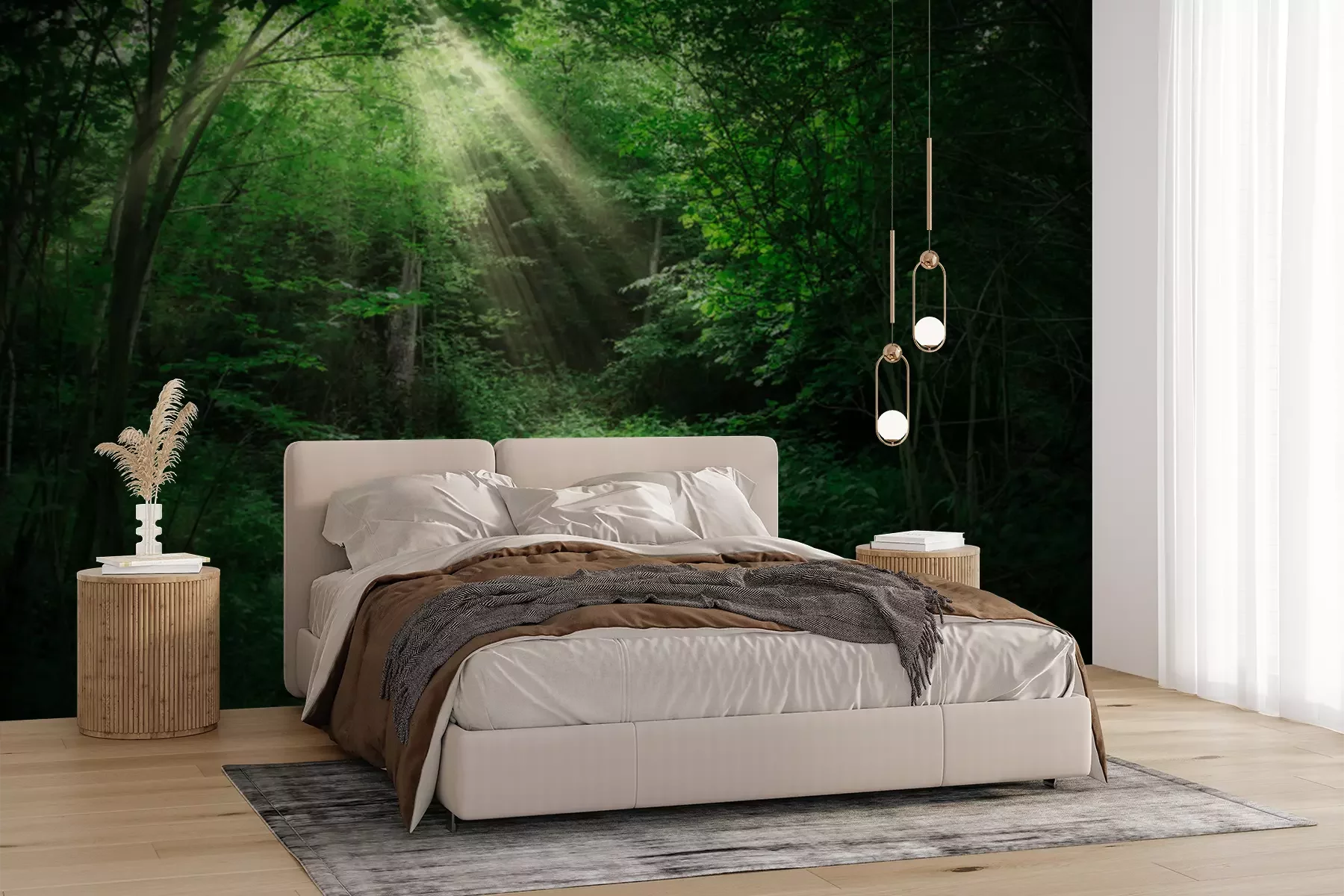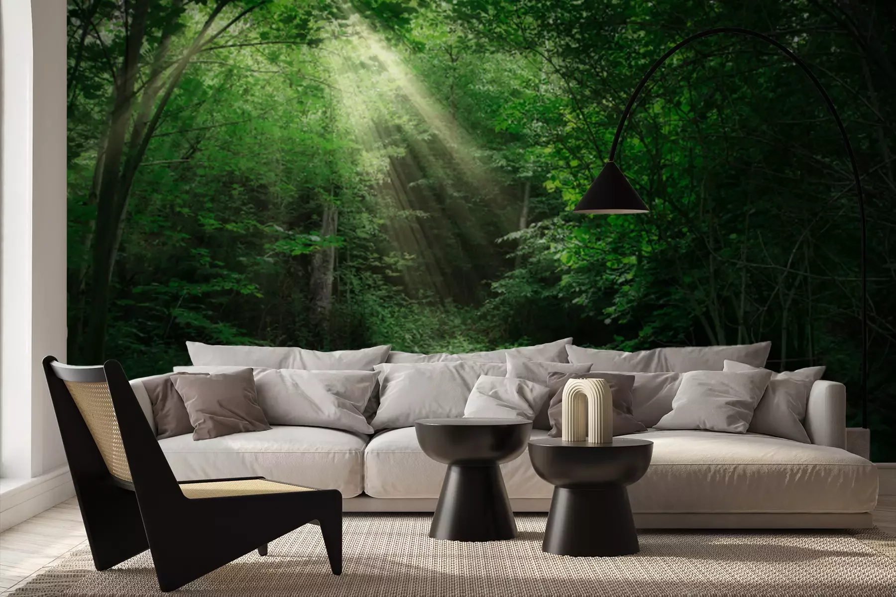 Fotobehang De stralen van de zon tussen de takken van bomen