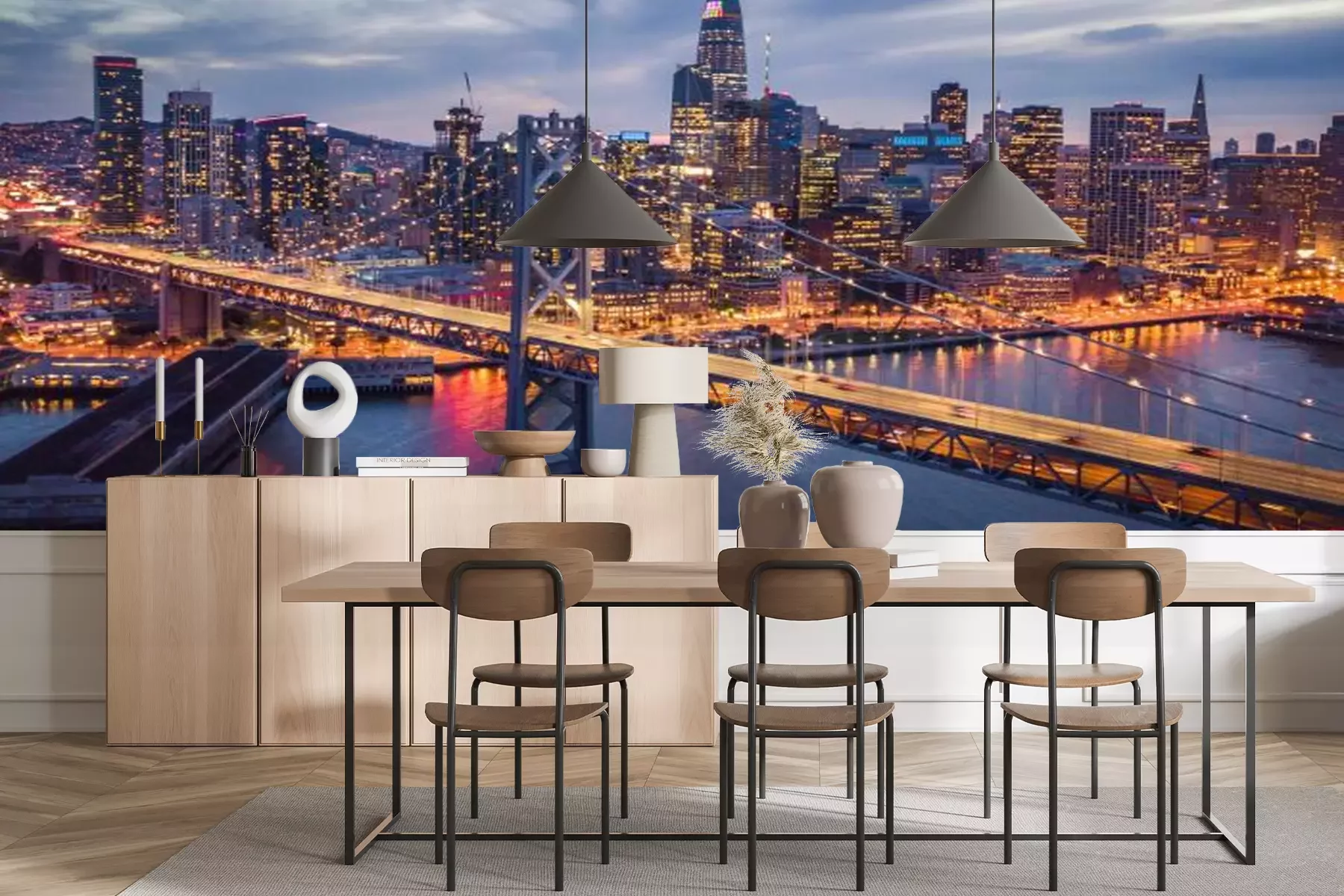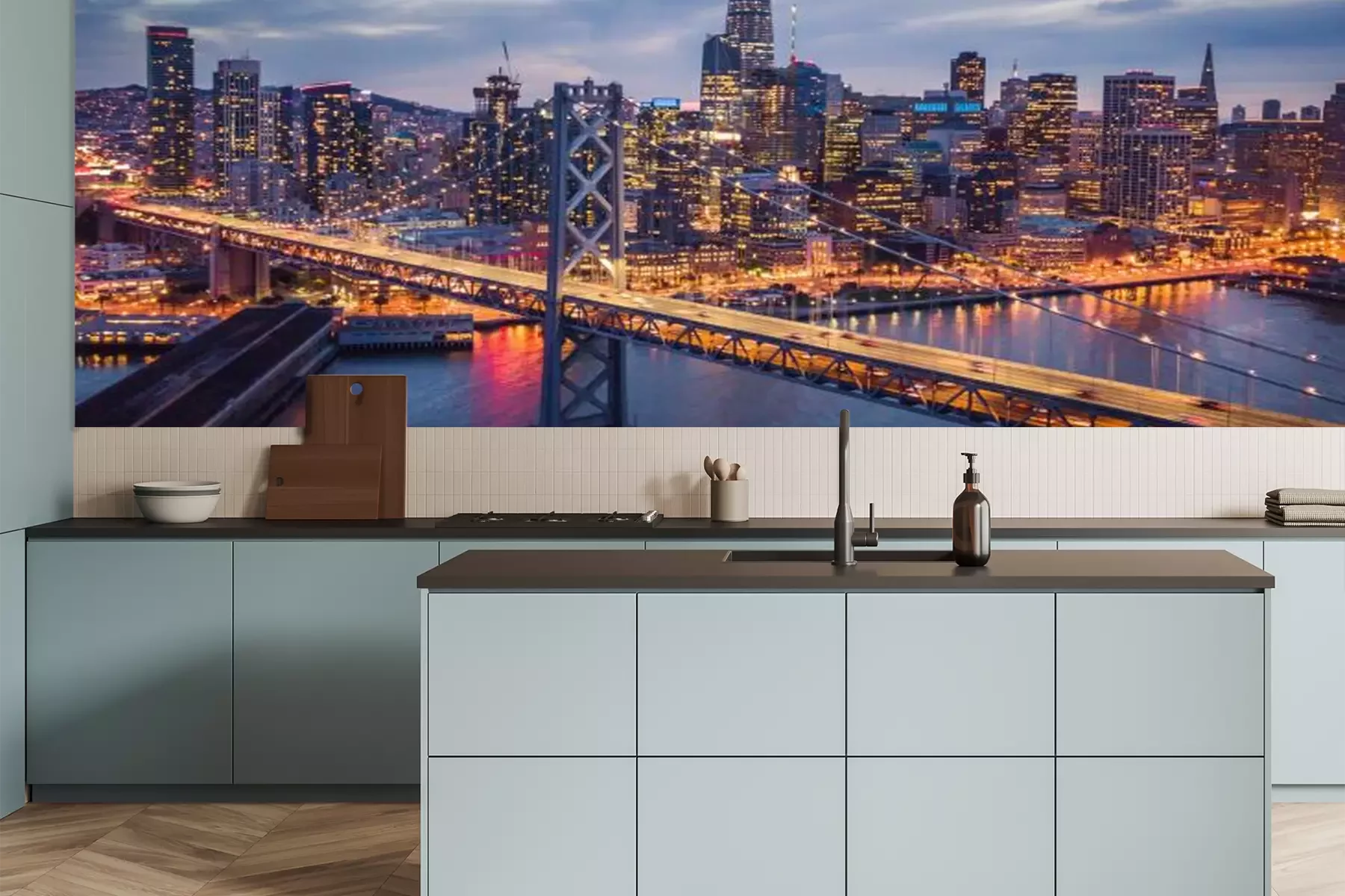 Fotobehang De verlichte Bay Bridge en de skyline van San Francisco 's nachts