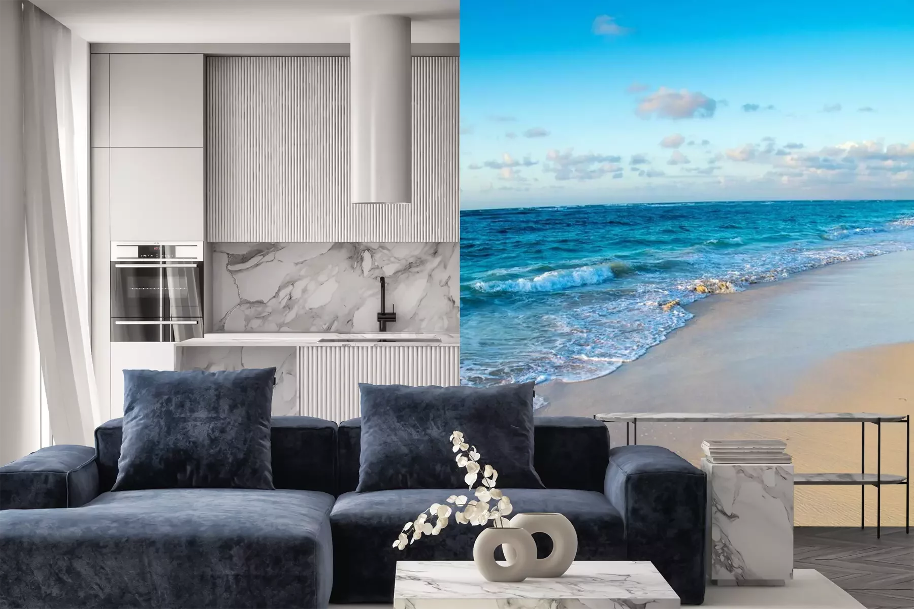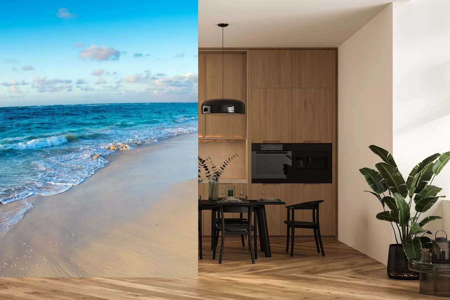 Het materiaal Premium+ is een gestructureerd vinyl op vlies met een gewicht van 255 g/m², dat kleine oneffenheden in de muur effectief camoufleert. De subtiele structuur van fijn zand geeft het oppervlak een exclusieve uitstraling, terwijl de halfmatte afwerking de diepte van de kleuren benadrukt. Het materiaal is dampdoorlatend, waardoor het ook in de keuken en badkamer kan worden gebruikt. De maximale breedte van één baan bedraagt 100 cm – bij grotere afmetingen wordt het fotobehang in meerdere gelijke banen verdeeld. De lijm wordt direct op de muur aangebracht en het behang wordt rand-aan-rand geplakt, wat zorgt voor een esthetisch resultaat zonder zichtbare naden. Het oppervlak kan gemakkelijk worden schoongemaakt door het voorzichtig af te nemen met een vochtige doek.