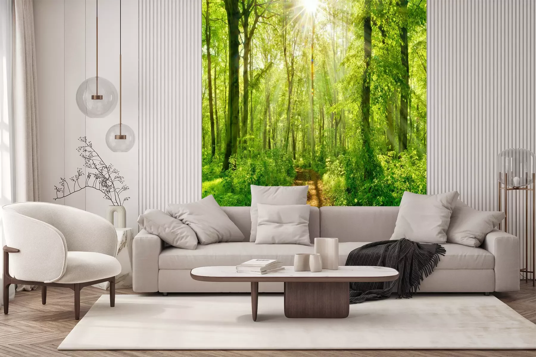 Het materiaal Premium+ is een gestructureerd vinyl op vlies met een gewicht van 255 g/m², dat kleine oneffenheden in de muur effectief camoufleert. De subtiele structuur van fijn zand geeft het oppervlak een exclusieve uitstraling, terwijl de halfmatte afwerking de diepte van de kleuren benadrukt. Het materiaal is dampdoorlatend, waardoor het ook in de keuken en badkamer kan worden gebruikt. De maximale breedte van één baan bedraagt 100 cm – bij grotere afmetingen wordt het fotobehang in meerdere gelijke banen verdeeld. De lijm wordt direct op de muur aangebracht en het behang wordt rand-aan-rand geplakt, wat zorgt voor een esthetisch resultaat zonder zichtbare naden. Het oppervlak kan gemakkelijk worden schoongemaakt door het voorzichtig af te nemen met een vochtige doek.