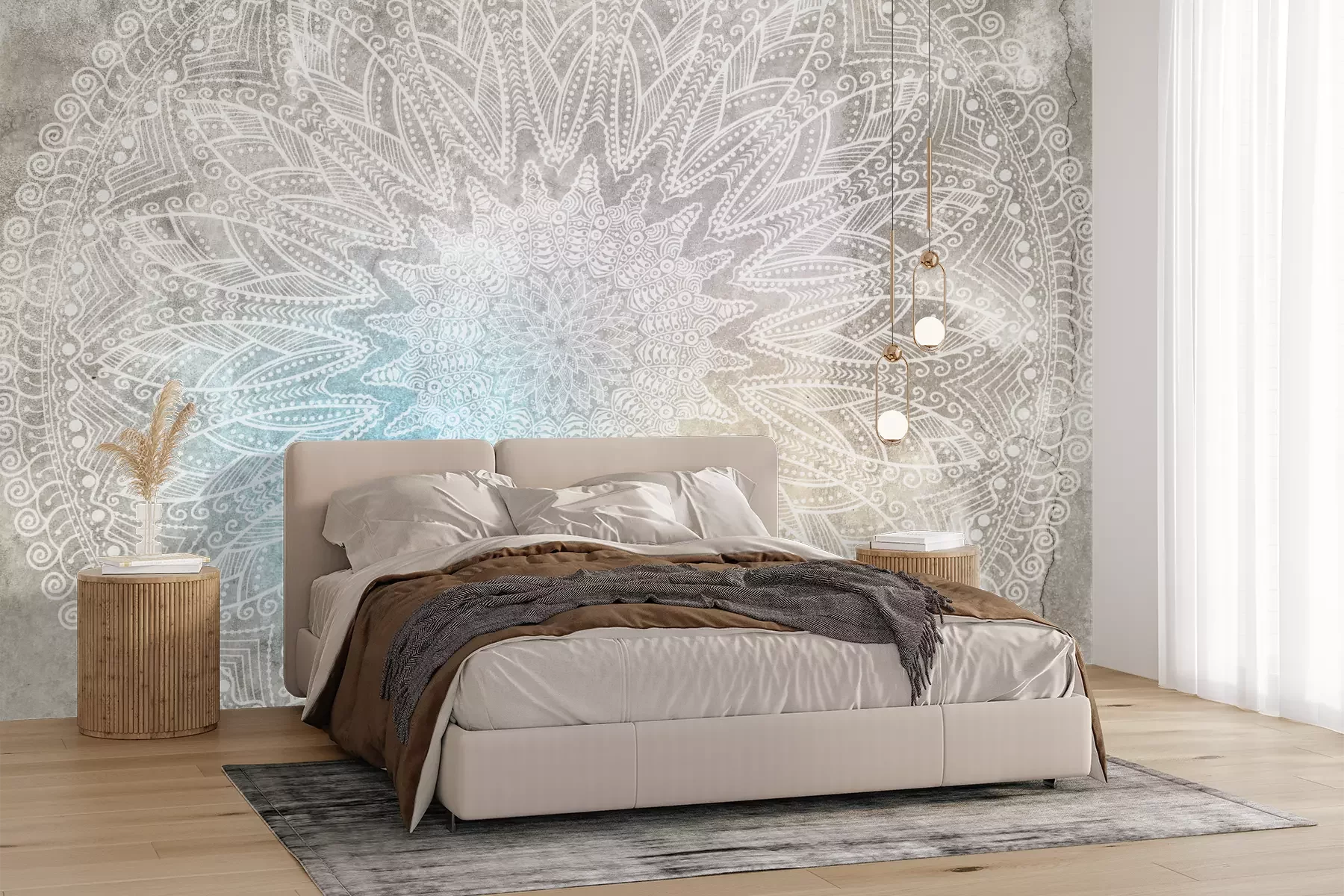 Het materiaal Premium+ is een gestructureerd vinyl op vlies met een gewicht van 255 g/m², dat kleine oneffenheden in de muur effectief camoufleert. De subtiele structuur van fijn zand geeft het oppervlak een exclusieve uitstraling, terwijl de halfmatte afwerking de diepte van de kleuren benadrukt. Het materiaal is dampdoorlatend, waardoor het ook in de keuken en badkamer kan worden gebruikt. De maximale breedte van één baan bedraagt 100 cm – bij grotere afmetingen wordt het fotobehang in meerdere gelijke banen verdeeld. De lijm wordt direct op de muur aangebracht en het behang wordt rand-aan-rand geplakt, wat zorgt voor een esthetisch resultaat zonder zichtbare naden. Het oppervlak kan gemakkelijk worden schoongemaakt door het voorzichtig af te nemen met een vochtige doek.