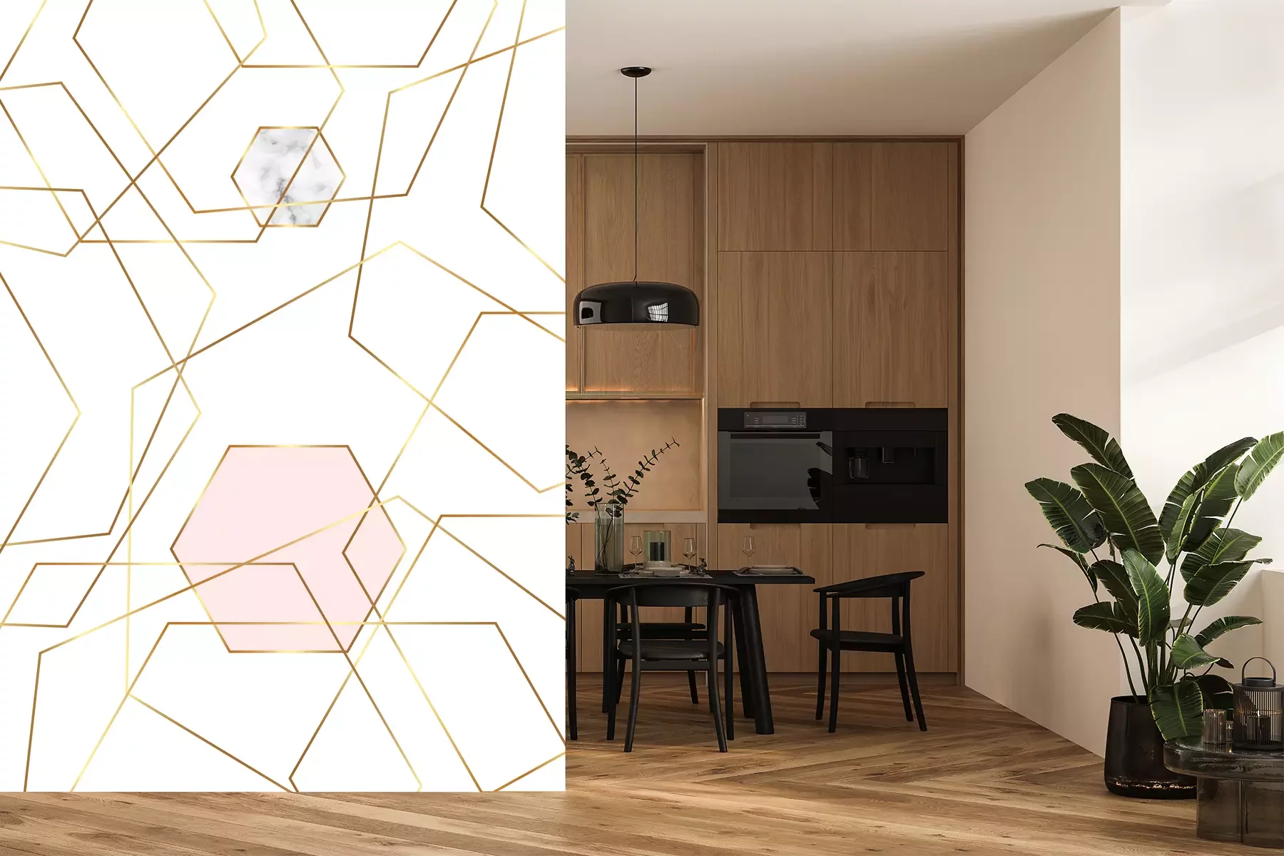 Het materiaal Premium+ is een gestructureerd vinyl op vlies met een gewicht van 255 g/m², dat kleine oneffenheden in de muur effectief camoufleert. De subtiele structuur van fijn zand geeft het oppervlak een exclusieve uitstraling, terwijl de halfmatte afwerking de diepte van de kleuren benadrukt. Het materiaal is dampdoorlatend, waardoor het ook in de keuken en badkamer kan worden gebruikt. De maximale breedte van één baan bedraagt 100 cm – bij grotere afmetingen wordt het fotobehang in meerdere gelijke banen verdeeld. De lijm wordt direct op de muur aangebracht en het behang wordt rand-aan-rand geplakt, wat zorgt voor een esthetisch resultaat zonder zichtbare naden. Het oppervlak kan gemakkelijk worden schoongemaakt door het voorzichtig af te nemen met een vochtige doek.