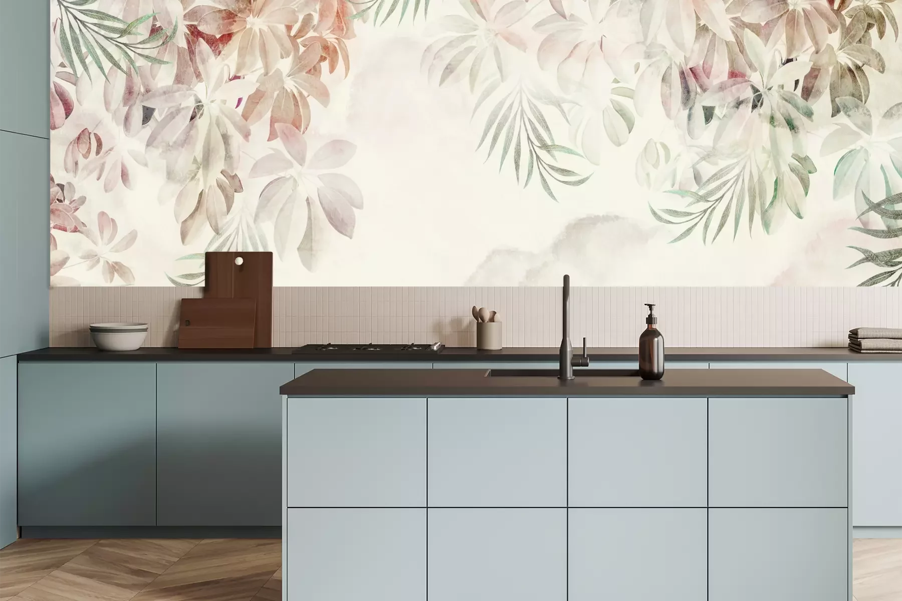 Het materiaal Premium is een glad vinyl op vlies, dat bestand is tegen uitrekken en vervorming. Het is dampdoorlatend – de muren kunnen vrij ademen – waardoor het geschikt is voor gebruik in de keuken en badkamer. Bij vervuiling kan het materiaal worden afgenomen met een vochtige doek. De maximale breedte van één baan bedraagt 95 of 105 cm, afhankelijk van de beschikbaarheid. Montage vindt plaats met de rand-aan-rand methode, wat een esthetisch resultaat zonder zichtbare naden oplevert. Omdat de lijm rechtstreeks op de muur wordt aangebracht, verloopt de installatie van het fotobehang snel en eenvoudig.