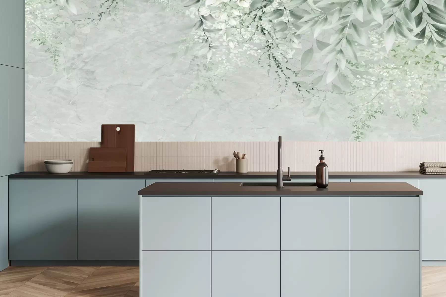 Het materiaal Premium is een glad vinyl op vlies, dat bestand is tegen uitrekken en vervorming. Het is dampdoorlatend – de muren kunnen vrij ademen – waardoor het geschikt is voor gebruik in de keuken en badkamer. Bij vervuiling kan het materiaal worden afgenomen met een vochtige doek. De maximale breedte van één baan bedraagt 95 of 105 cm, afhankelijk van de beschikbaarheid. Montage vindt plaats met de rand-aan-rand methode, wat een esthetisch resultaat zonder zichtbare naden oplevert. Omdat de lijm rechtstreeks op de muur wordt aangebracht, verloopt de installatie van het fotobehang snel en eenvoudig.
