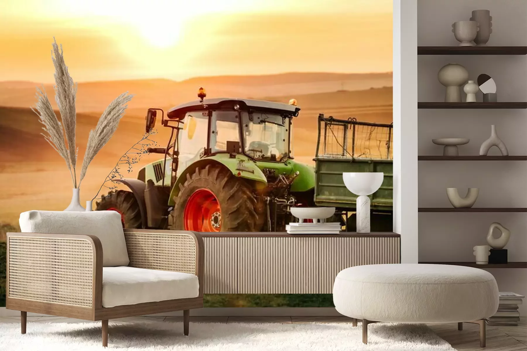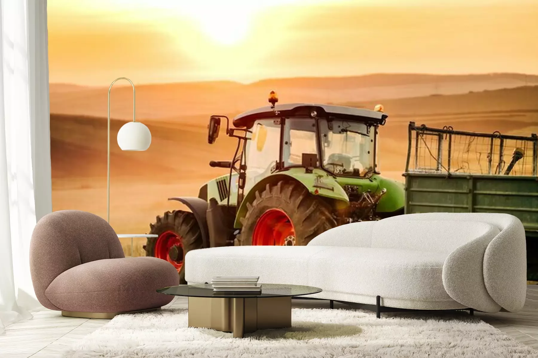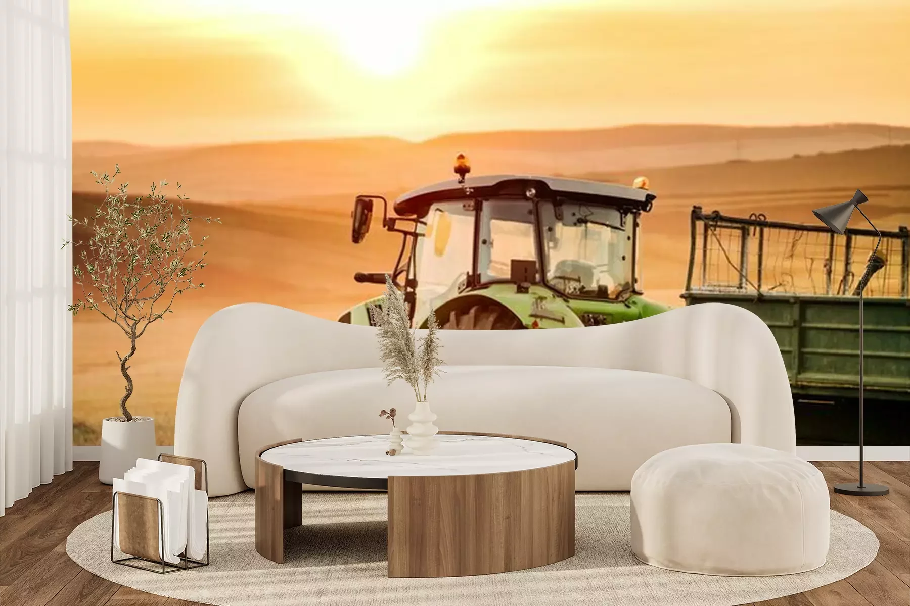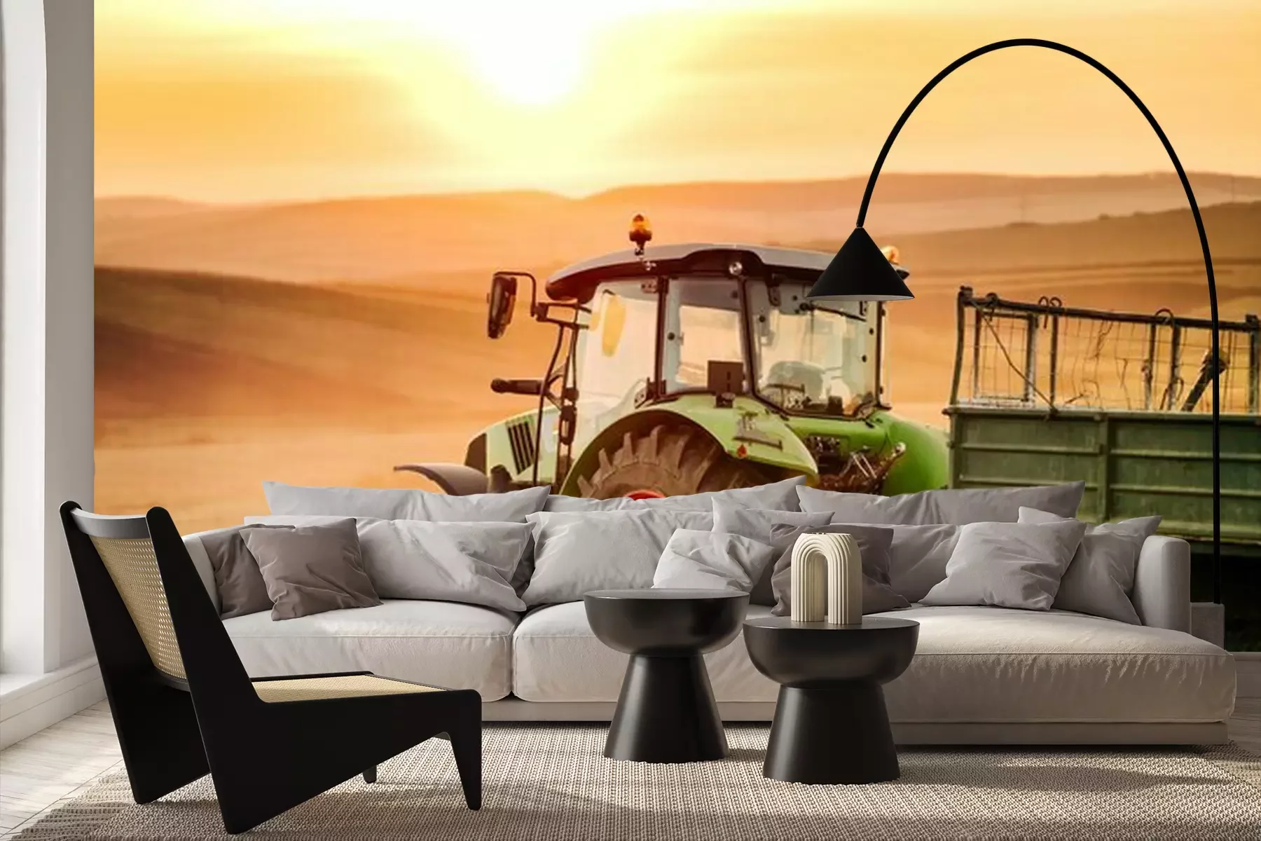 Fotobehang Details van landbouwer die op de gebieden met tractor aan een zonsondergangachtergrond werkt. Landbouw industrie details
