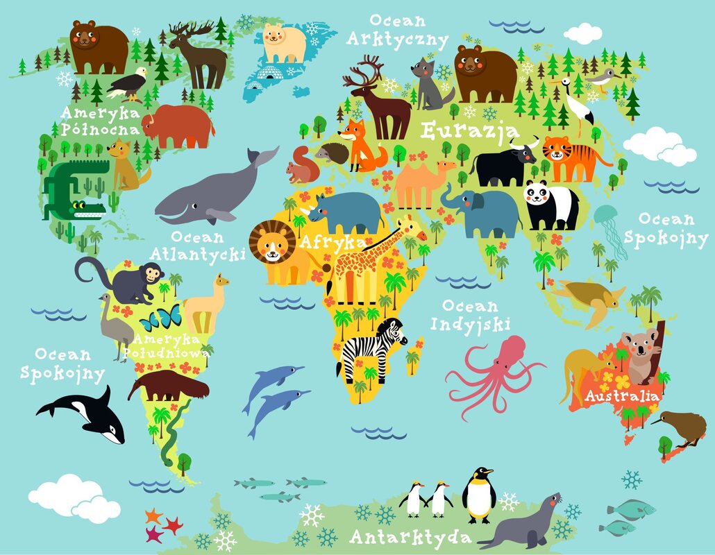 Fotobehang: Dieren van de wereldkaart in het Pools
