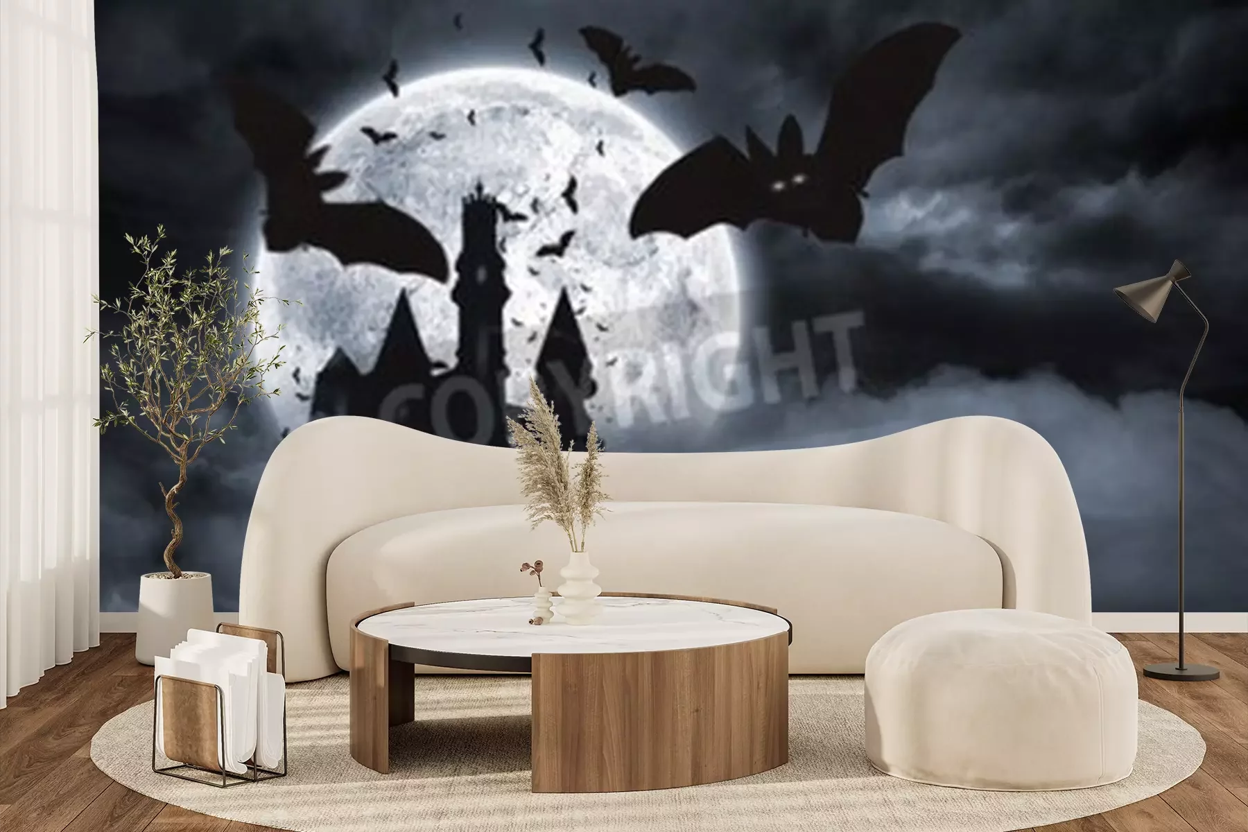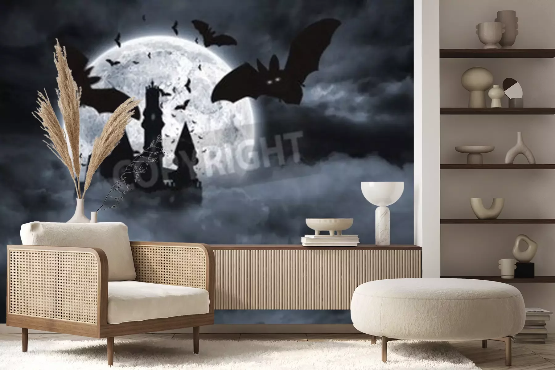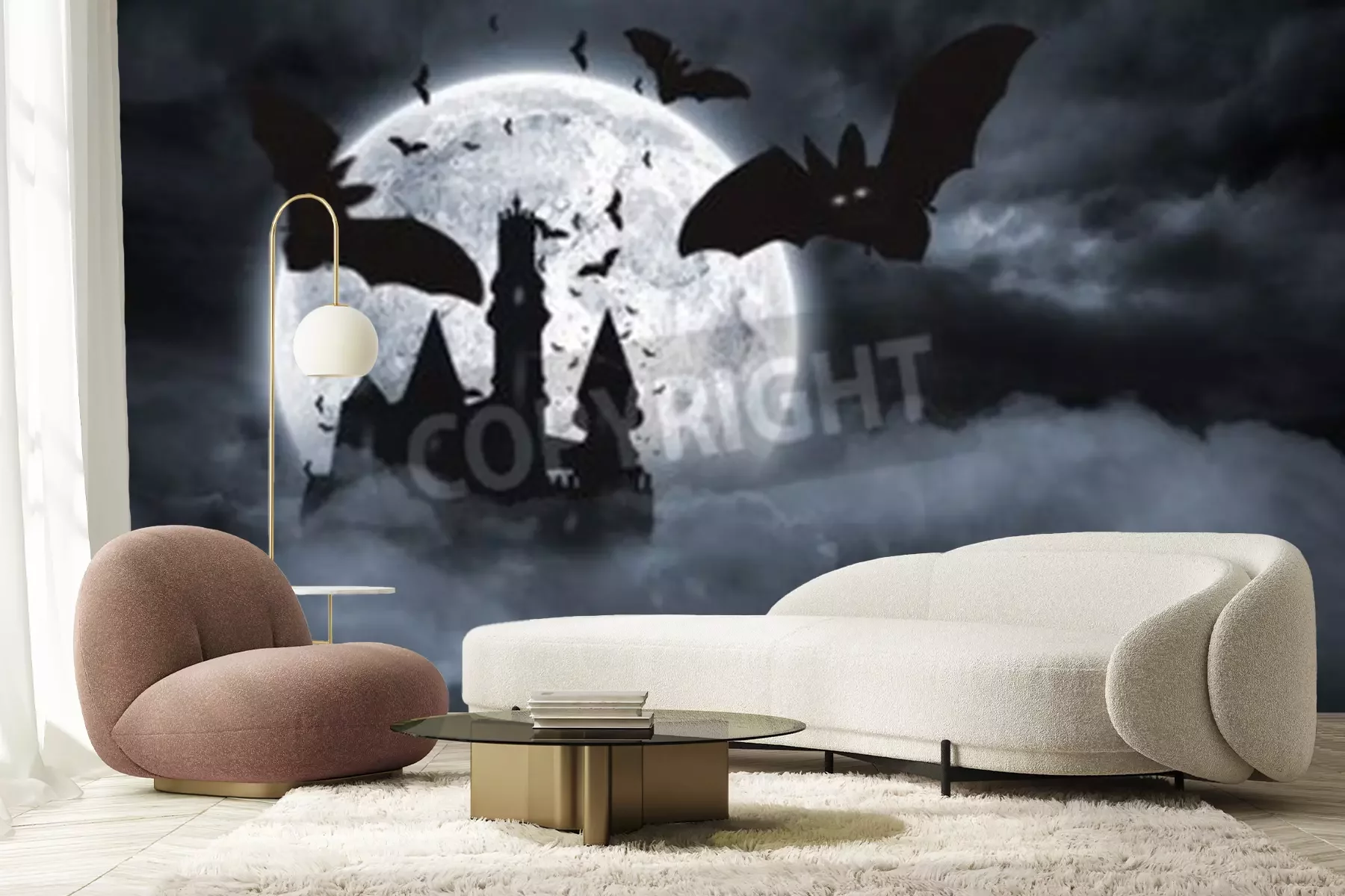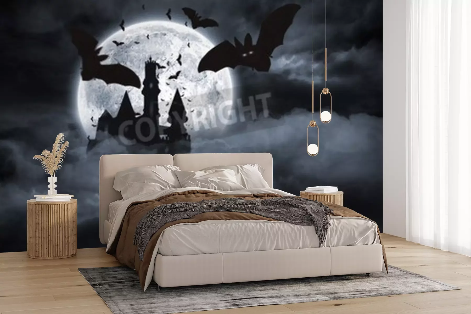 Fotobehang Digitaal gegenereerde vleermuizen vliegen van draculas kasteel