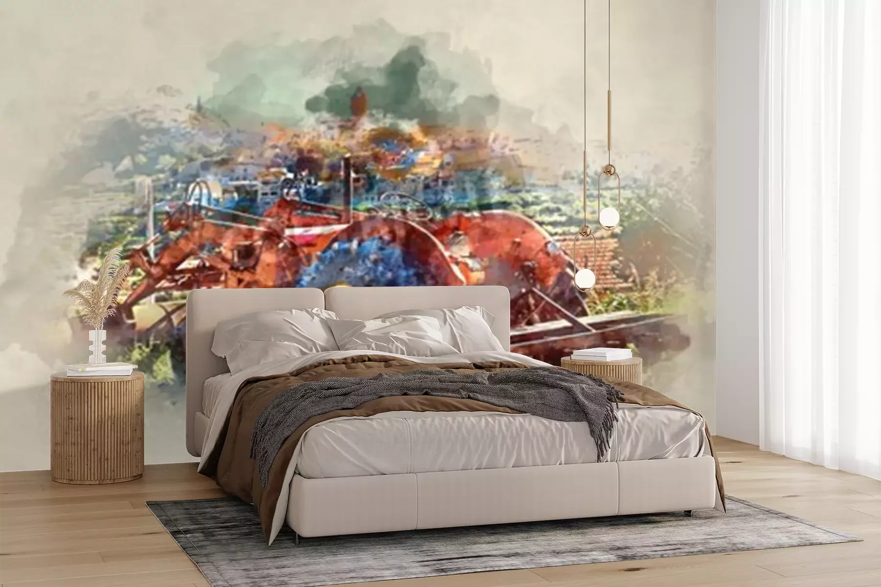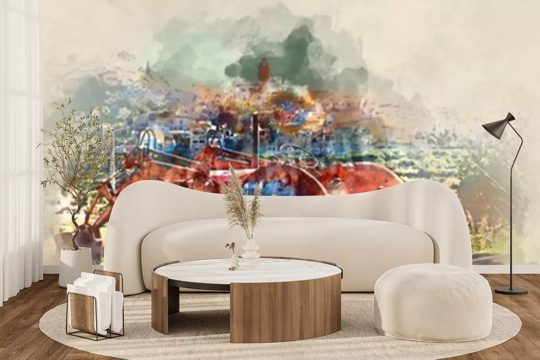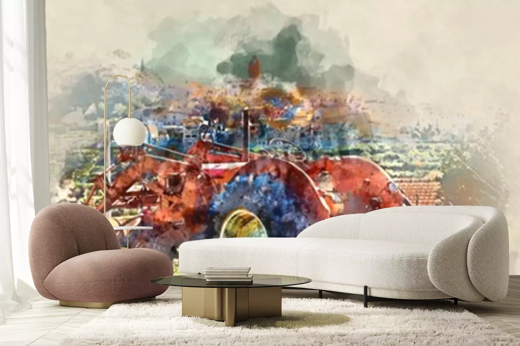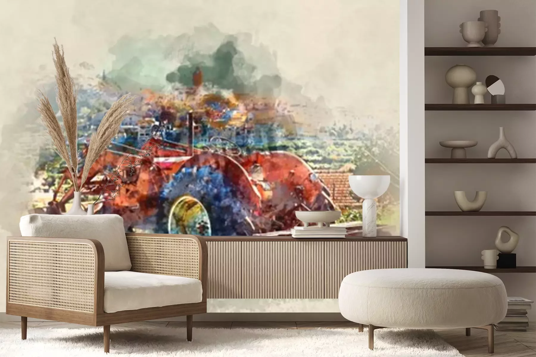 Fotobehang Digitaal waterverf schilderij van oude trekker tegen dorpsachtergrond. Polop de la Marina dorp in Spanje