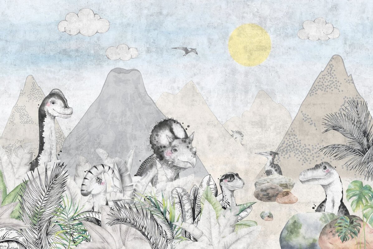 Fotobehang: Dinosaurussen in een sprookjesland met vulkanen