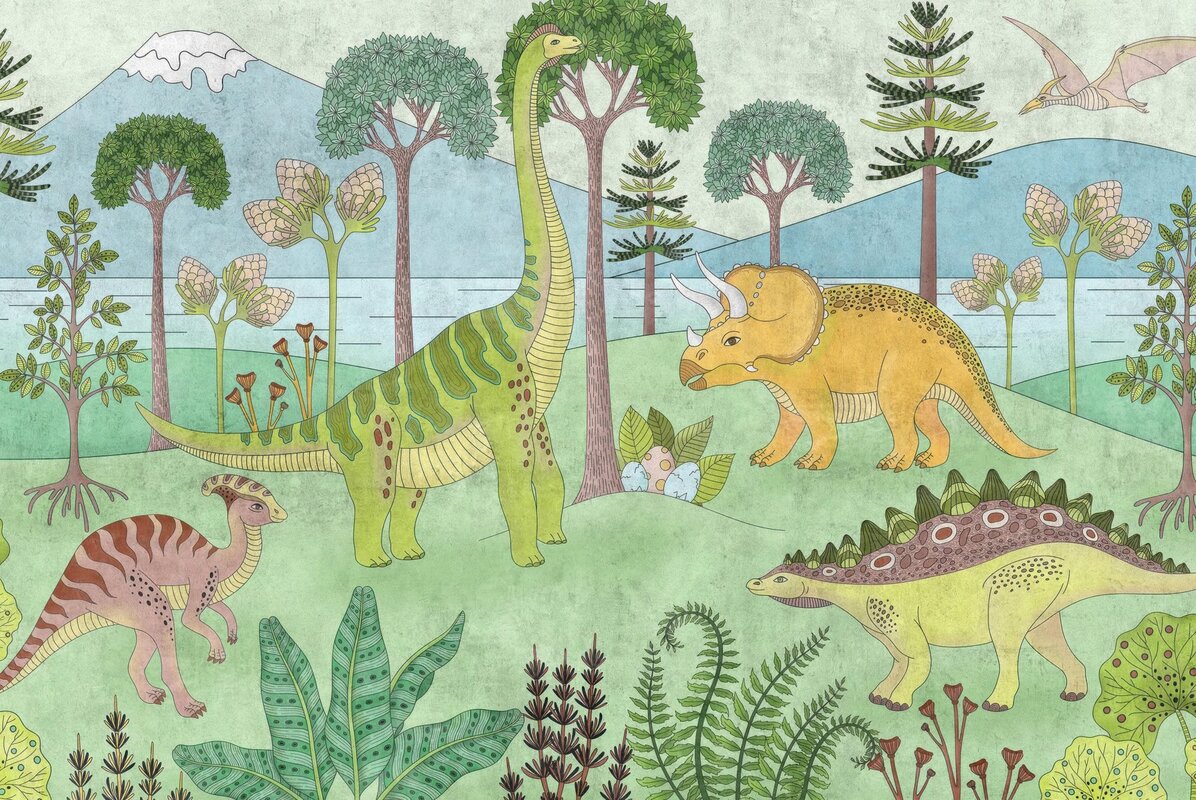 Fotobehang: Dinosaurussen tussen de bomen tegen een berglandschap