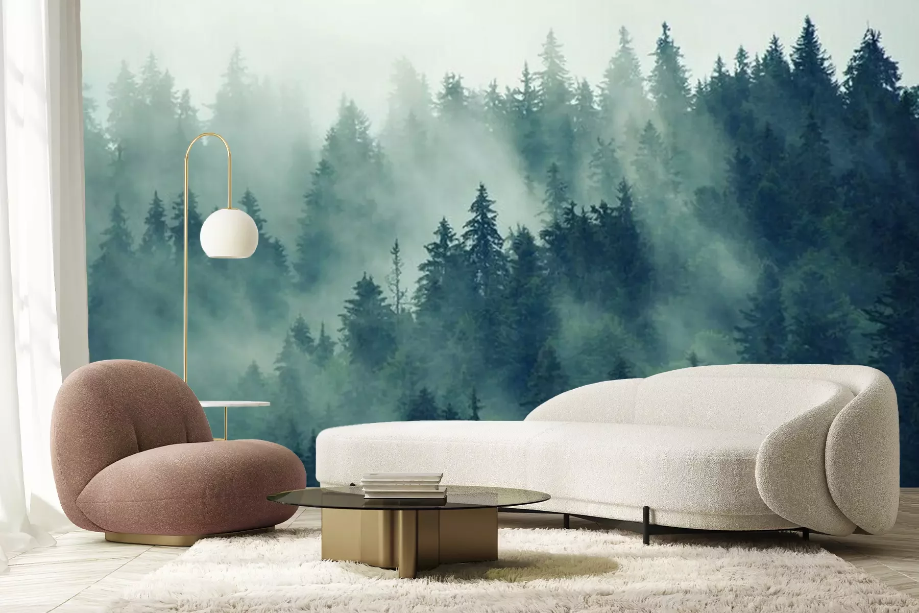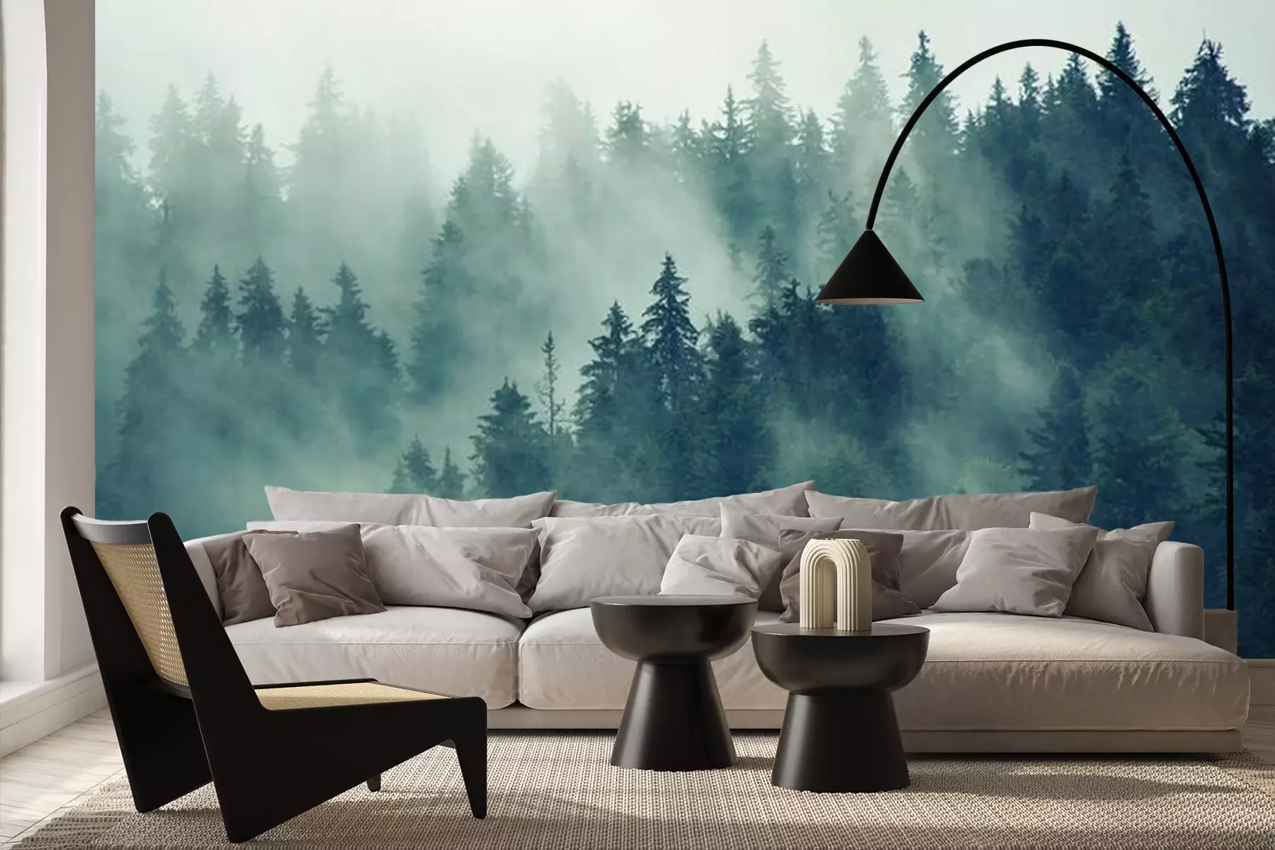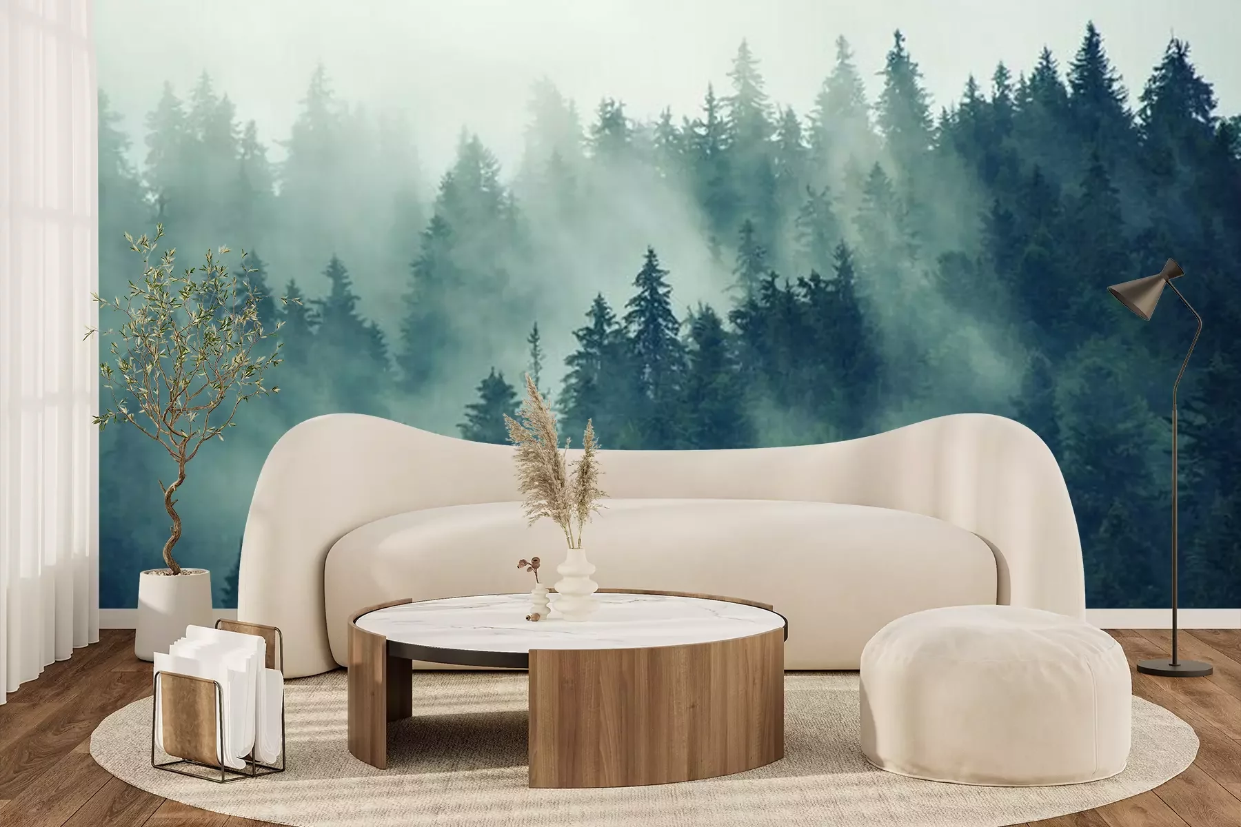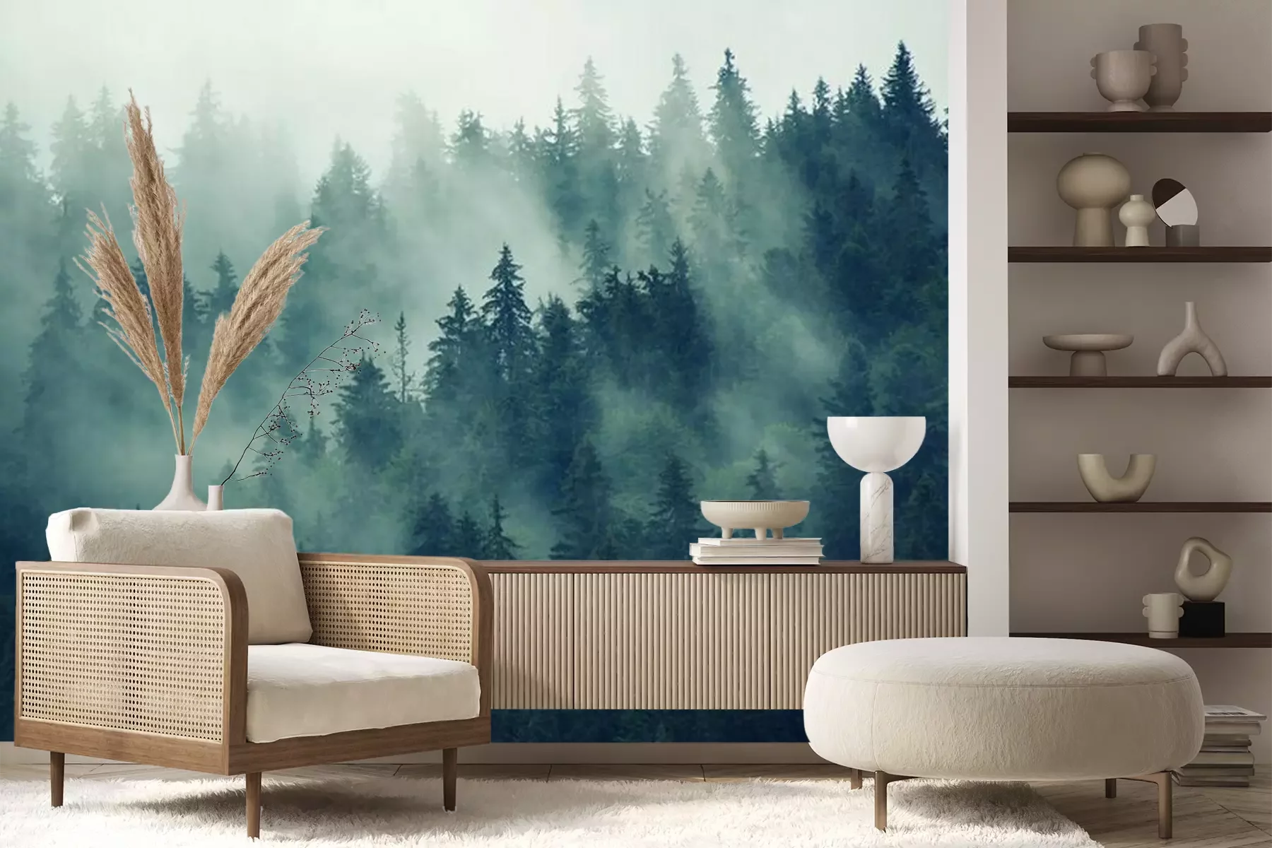 Naaldbomen in de mist, bos in de mistFotobehang