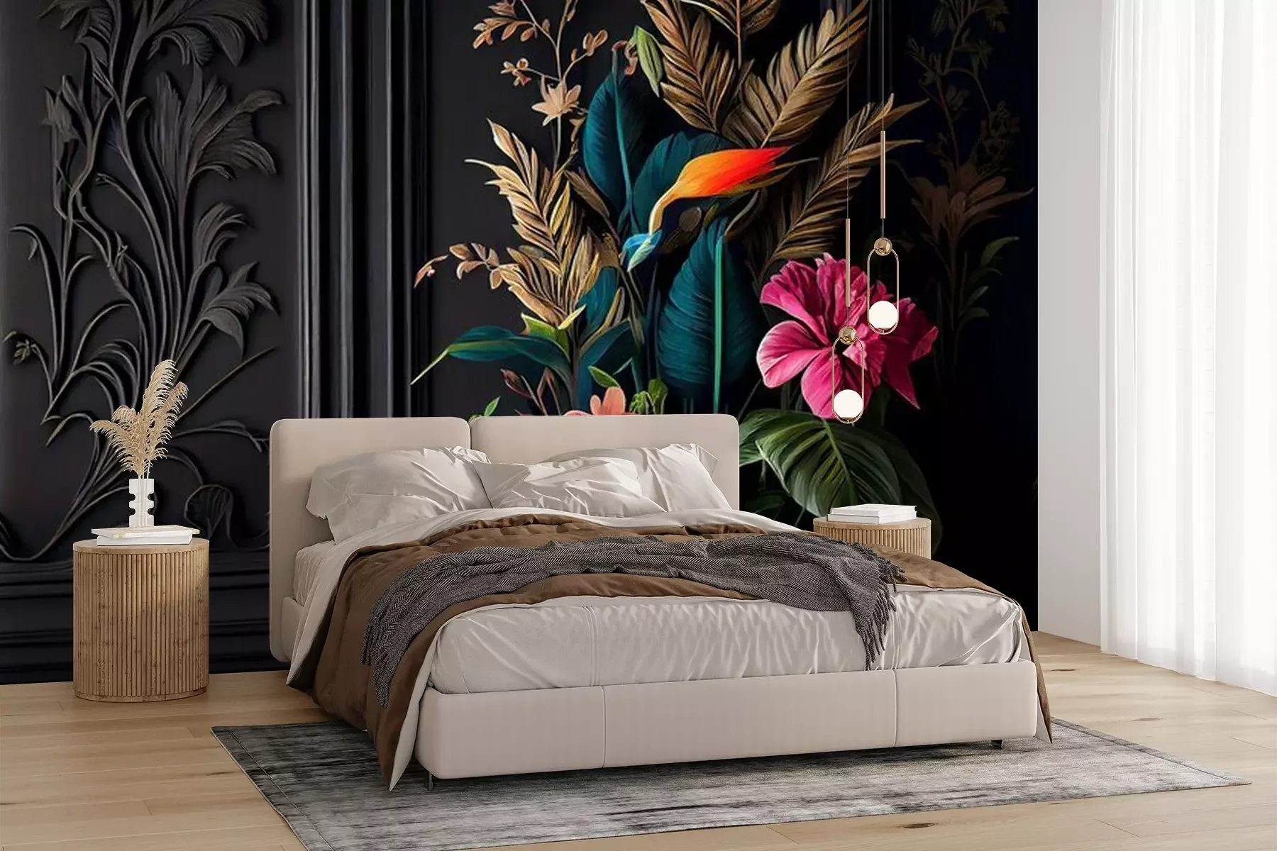Fotobehang Donker stucwerk en exotische 3D bloemen