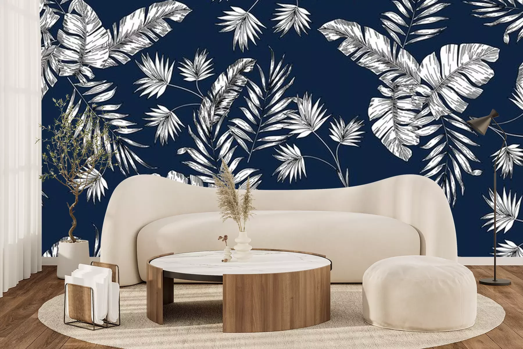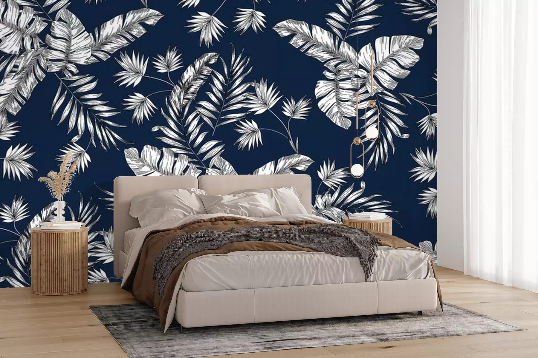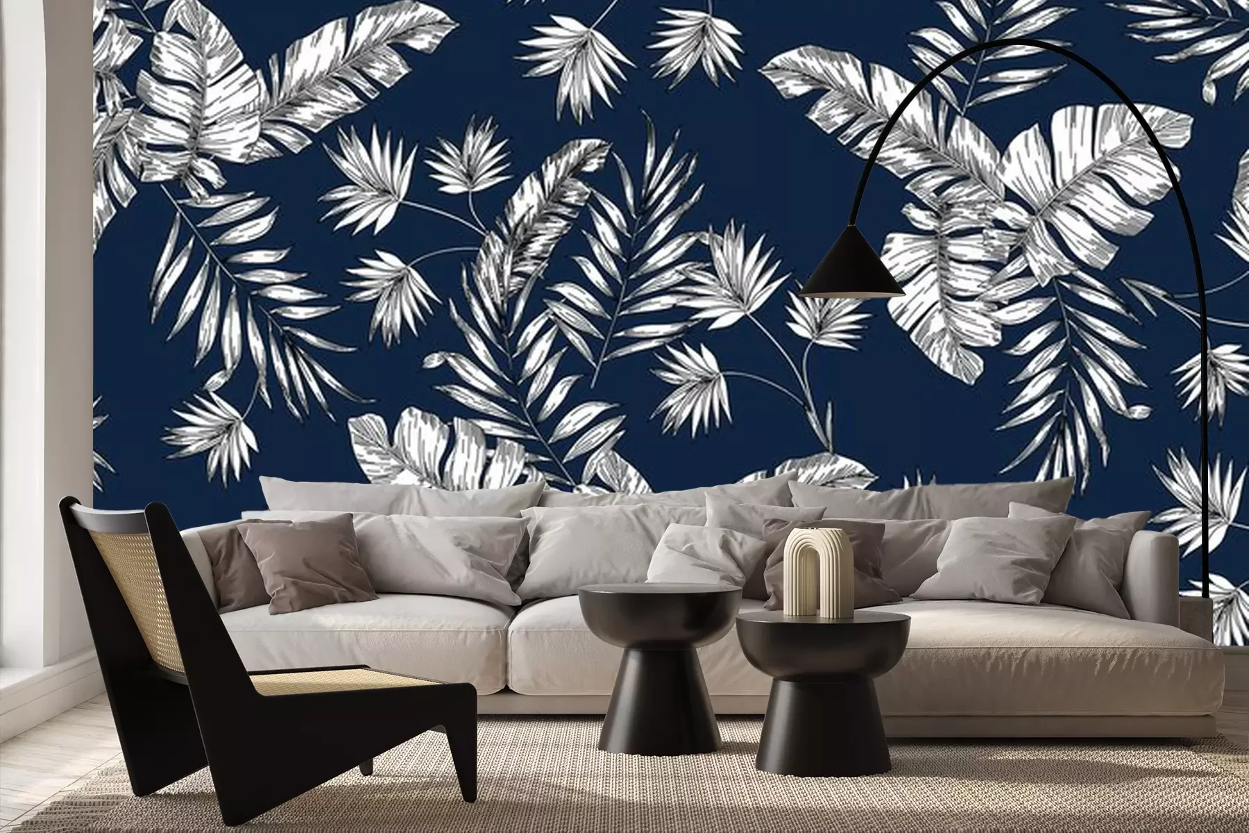 Fotobehang Donkerblauwe achtergrond voor exotische bladeren
