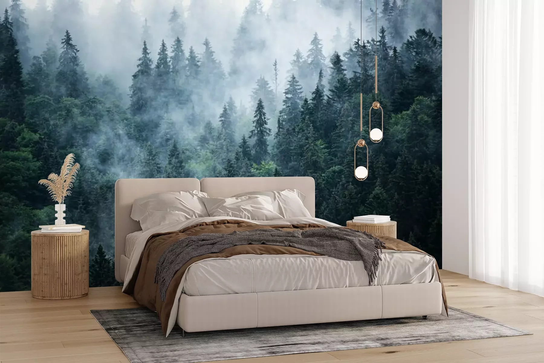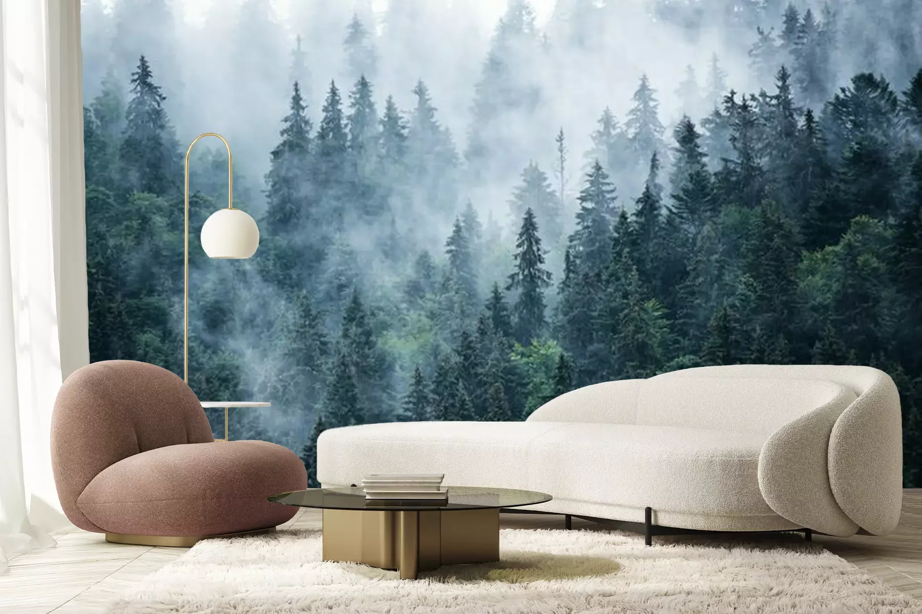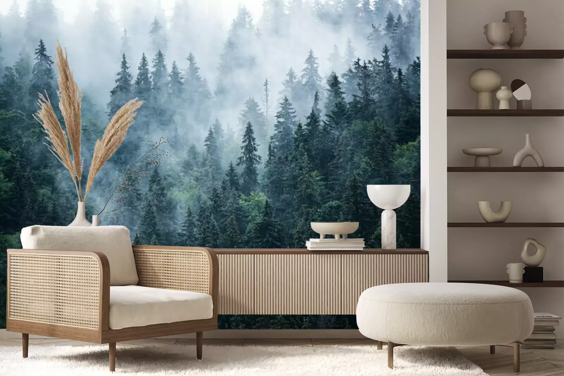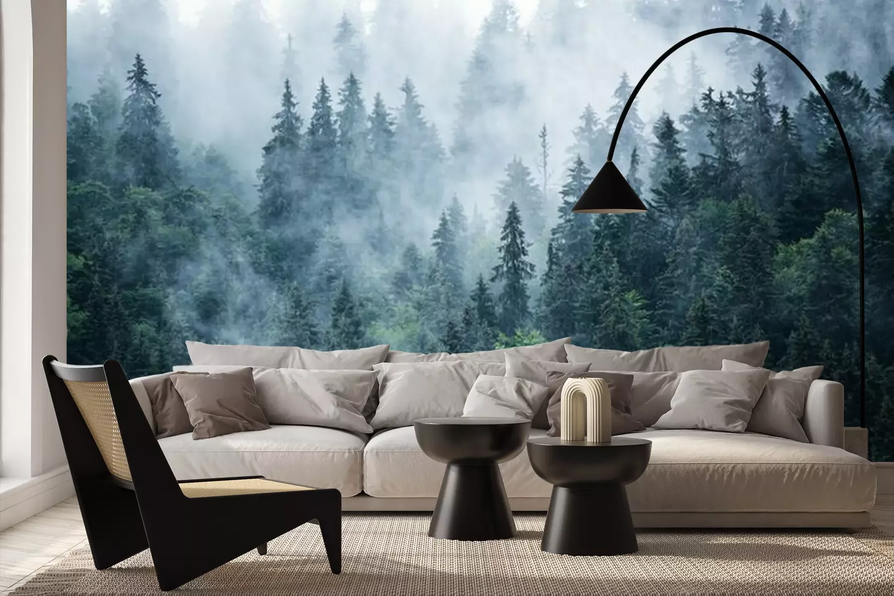 Een sparrenbos gehuld in ochtendmistFotobehang