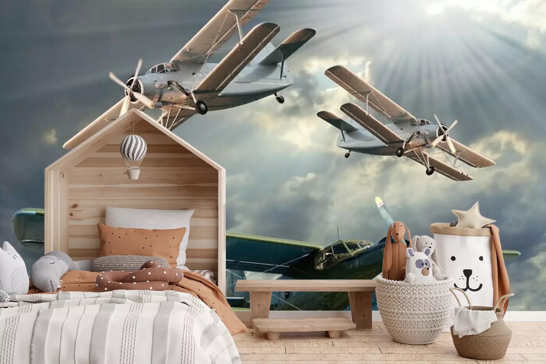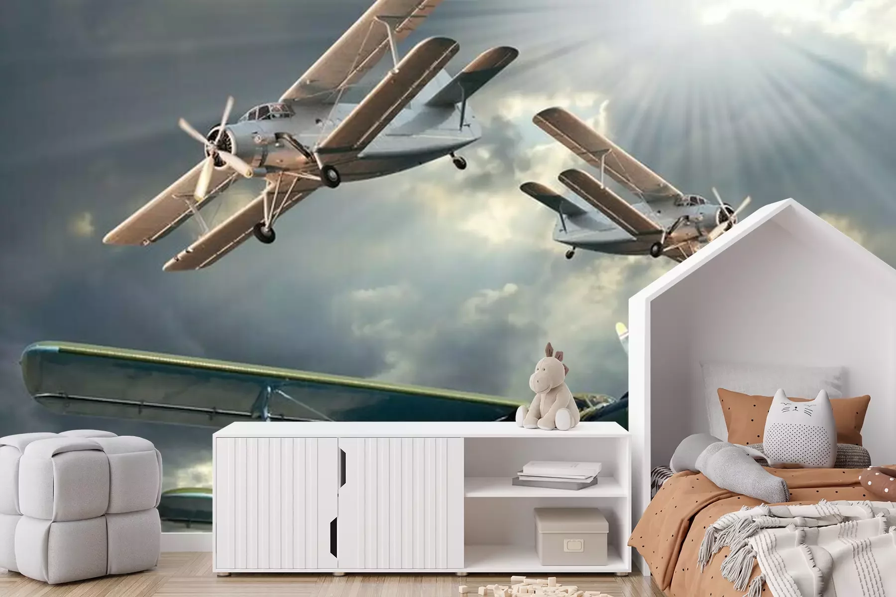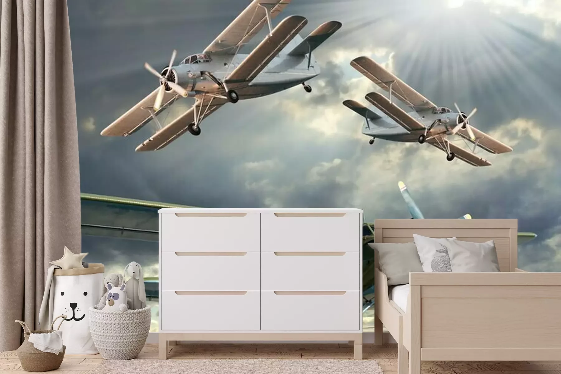Retro vliegtuigen in beweging in de luchtFotobehang
