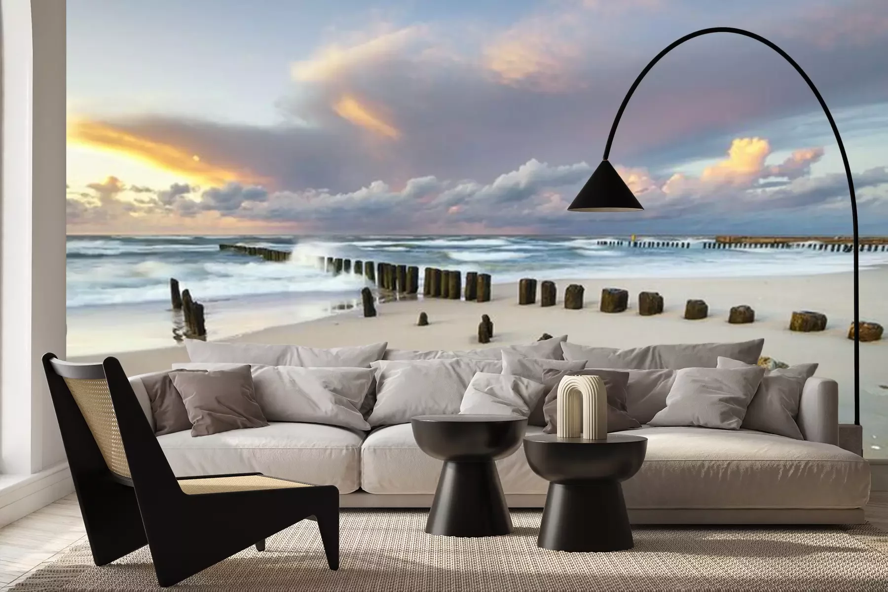 Het materiaal Premium+ is een gestructureerd vinyl op vlies met een gewicht van 255 g/m², dat kleine oneffenheden in de muur effectief camoufleert. De subtiele structuur van fijn zand geeft het oppervlak een exclusieve uitstraling, terwijl de halfmatte afwerking de diepte van de kleuren benadrukt. Het materiaal is dampdoorlatend, waardoor het ook in de keuken en badkamer kan worden gebruikt. De maximale breedte van één baan bedraagt 100 cm – bij grotere afmetingen wordt het fotobehang in meerdere gelijke banen verdeeld. De lijm wordt direct op de muur aangebracht en het behang wordt rand-aan-rand geplakt, wat zorgt voor een esthetisch resultaat zonder zichtbare naden. Het oppervlak kan gemakkelijk worden schoongemaakt door het voorzichtig af te nemen met een vochtige doek.