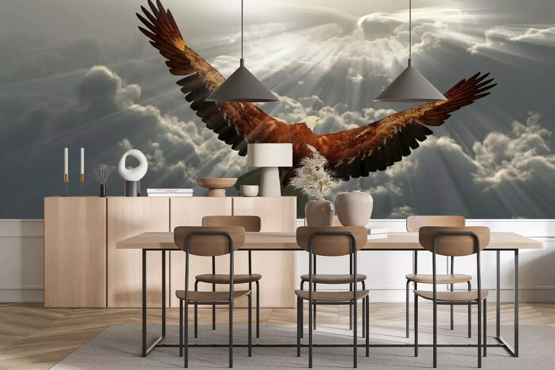 Het materiaal Premium+ is een gestructureerd vinyl op vlies met een gewicht van 255 g/m², dat kleine oneffenheden in de muur effectief camoufleert. De subtiele structuur van fijn zand geeft het oppervlak een exclusieve uitstraling, terwijl de halfmatte afwerking de diepte van de kleuren benadrukt. Het materiaal is dampdoorlatend, waardoor het ook in de keuken en badkamer kan worden gebruikt. De maximale breedte van één baan bedraagt 100 cm – bij grotere afmetingen wordt het fotobehang in meerdere gelijke banen verdeeld. De lijm wordt direct op de muur aangebracht en het behang wordt rand-aan-rand geplakt, wat zorgt voor een esthetisch resultaat zonder zichtbare naden. Het oppervlak kan gemakkelijk worden schoongemaakt door het voorzichtig af te nemen met een vochtige doek.