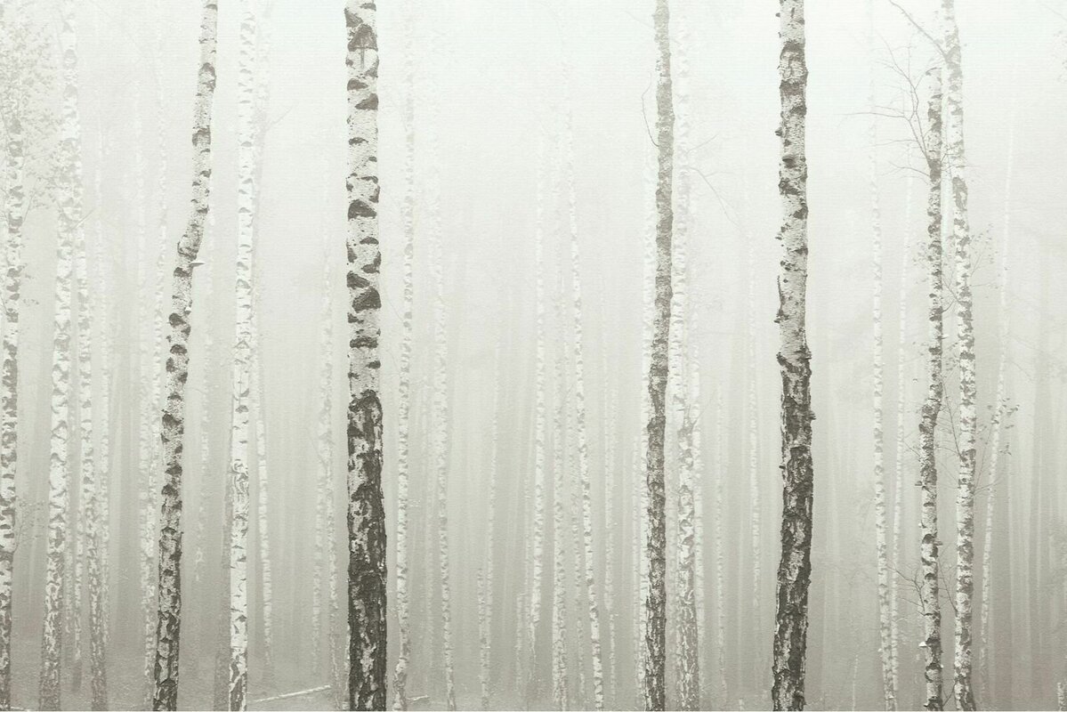 Fotobehang: Een berkenbos gehuld in mist