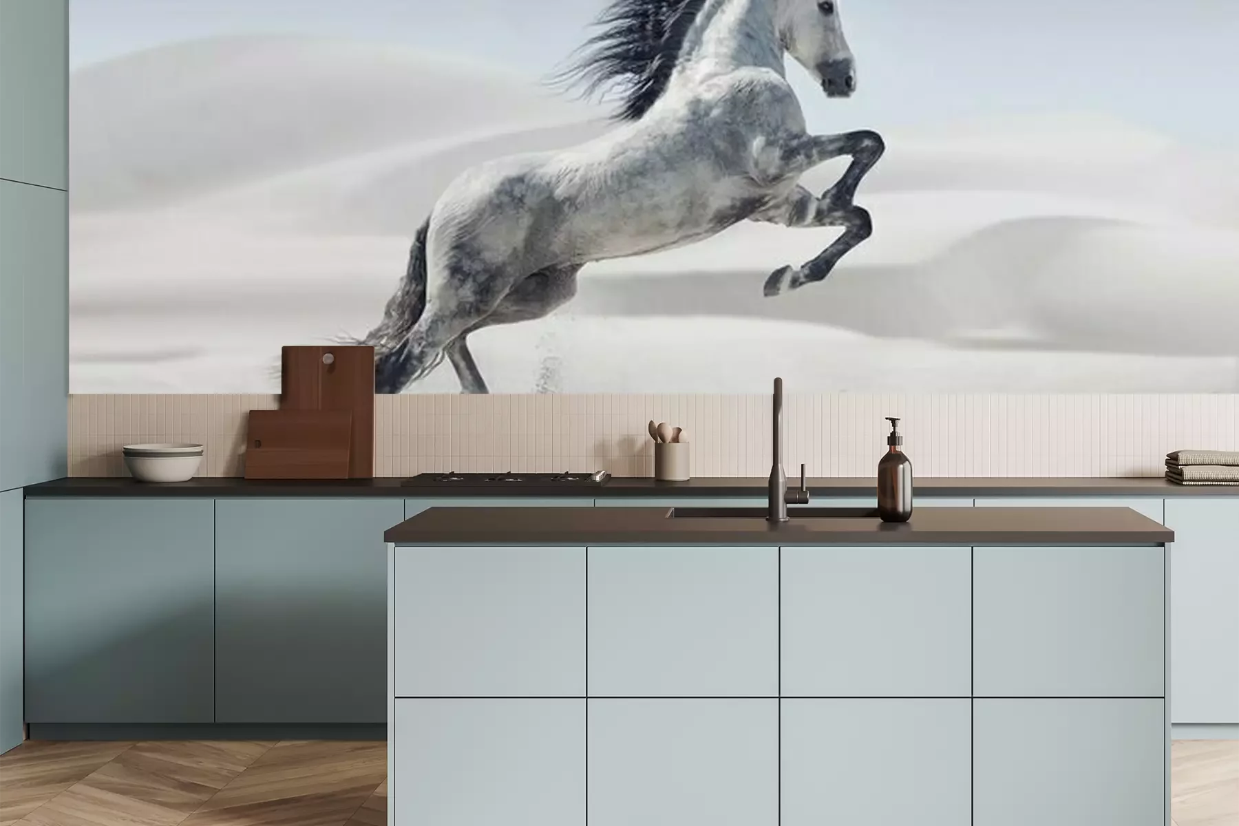 Het materiaal Premium is een glad vinyl op vlies, dat bestand is tegen uitrekken en vervorming. Het is dampdoorlatend – de muren kunnen vrij ademen – waardoor het geschikt is voor gebruik in de keuken en badkamer. Bij vervuiling kan het materiaal worden afgenomen met een vochtige doek. De maximale breedte van één baan bedraagt 95 of 105 cm, afhankelijk van de beschikbaarheid. Montage vindt plaats met de rand-aan-rand methode, wat een esthetisch resultaat zonder zichtbare naden oplevert. Omdat de lijm rechtstreeks op de muur wordt aangebracht, verloopt de installatie van het fotobehang snel en eenvoudig.