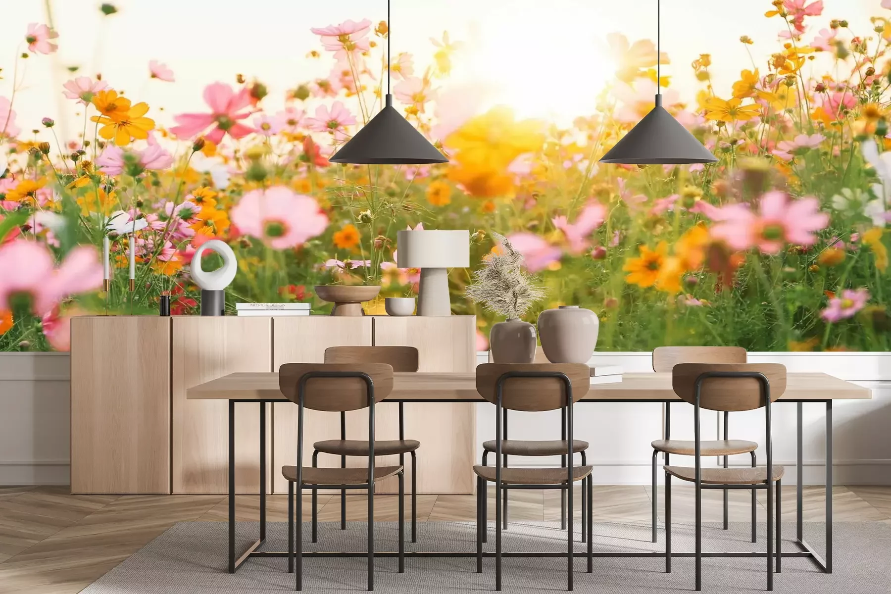 Het materiaal Premium+ is een gestructureerd vinyl op vlies met een gewicht van 255 g/m², dat kleine oneffenheden in de muur effectief camoufleert. De subtiele structuur van fijn zand geeft het oppervlak een exclusieve uitstraling, terwijl de halfmatte afwerking de diepte van de kleuren benadrukt. Het materiaal is dampdoorlatend, waardoor het ook in de keuken en badkamer kan worden gebruikt. De maximale breedte van één baan bedraagt 100 cm – bij grotere afmetingen wordt het fotobehang in meerdere gelijke banen verdeeld. De lijm wordt direct op de muur aangebracht en het behang wordt rand-aan-rand geplakt, wat zorgt voor een esthetisch resultaat zonder zichtbare naden. Het oppervlak kan gemakkelijk worden schoongemaakt door het voorzichtig af te nemen met een vochtige doek.